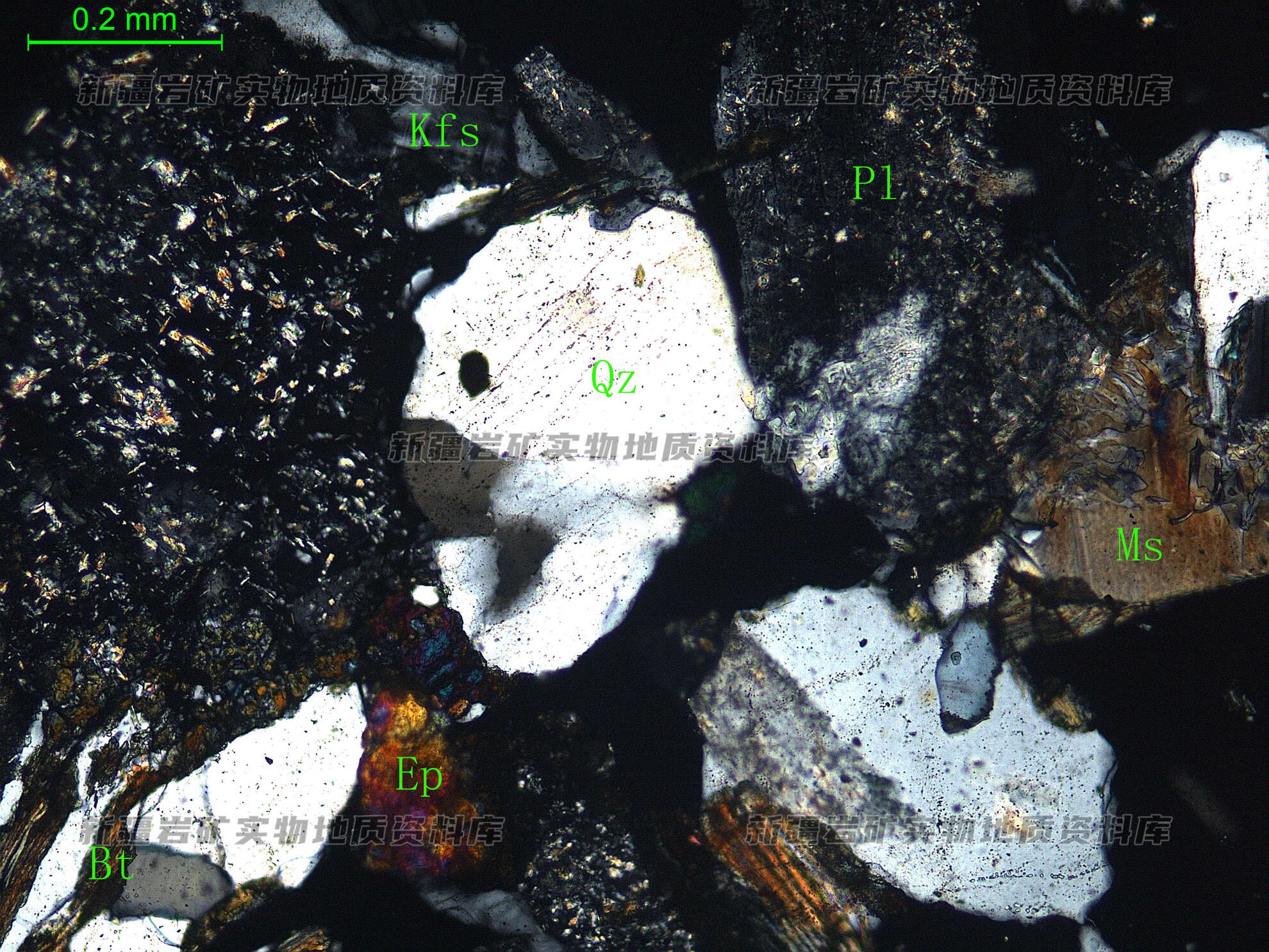 岩石特征描述: 更-中长石(Pl)半自形板状,表面绢云母化、绿帘石化,微显环带结构;钾长石(Kfs)半自形板状,交代更-中长石,其内见交代残留的更-中长石。黑云母(Bt)片状,其边缘多被黝帘石交代;白云母片状;在长石之间有半自形粒状的绿帘石(Ep);石英(Qz)半自形粒状,表面多裂纹,波状消光。