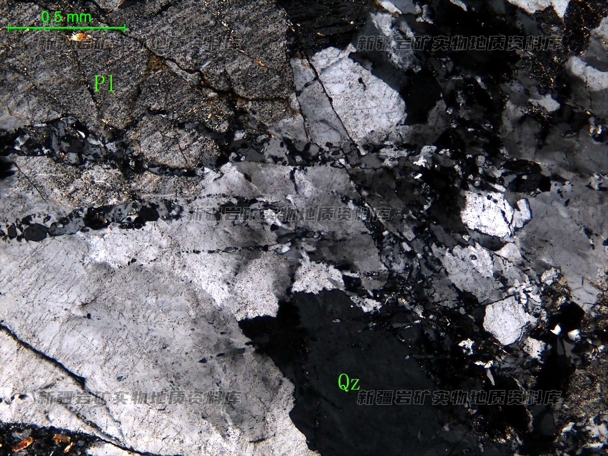 岩石有半自形板状的更长石,更长石表面有次生绢云母;在更长石之间有少量钾长石;在长石之间有半自形粒状的石英。