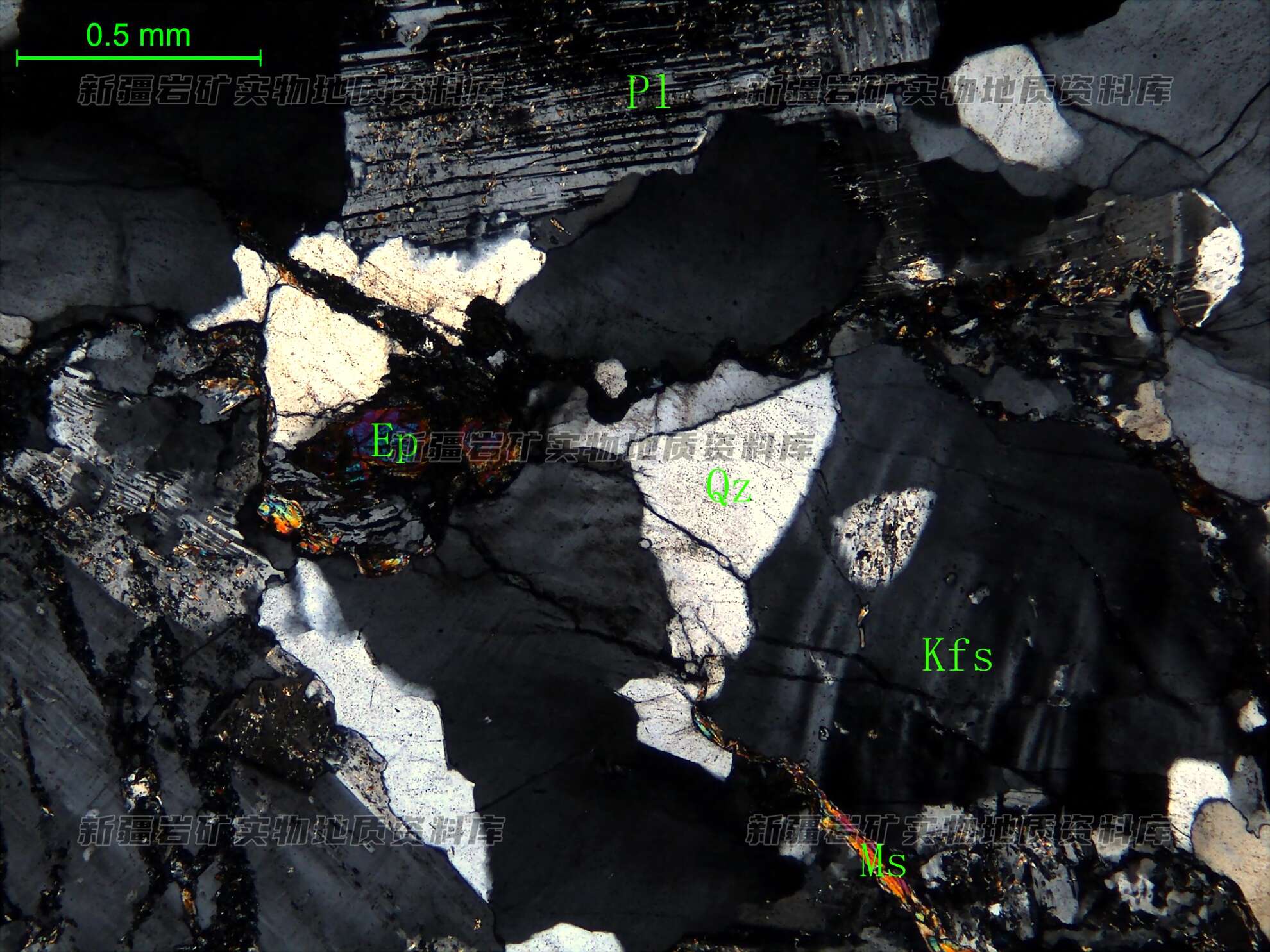 岩石特征描述: 更-中长石(Pl)半自形板状,表面见次生绢云母和细粒绿帘石,微显环带结构;钾长石(Kfs)半自形板状,形成似斑晶,部分交代更-中长石;石英(Qz)半自形粒状,波状消光;白云母(Ms)片状,沿其边缘多被绿帘石(Ep)交代。