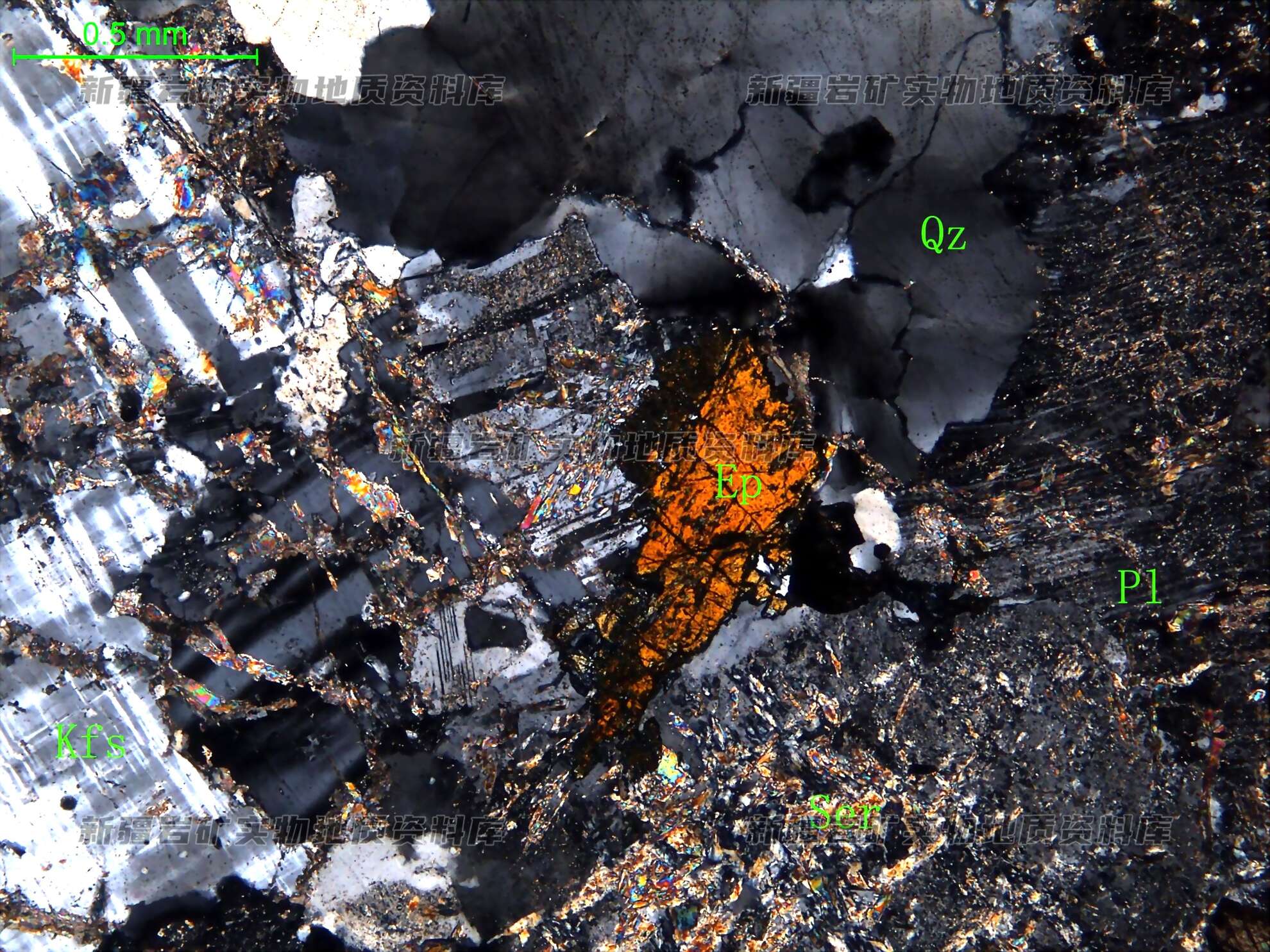 岩石特征描述: 岩石中主要矿物为更-中长石(Pl)、钾长石(Kfs)和石英(Qz),次为白云母和绿帘石(Ep)。更-中长石半自形板状,表面见次生绢云母(Ser)和细粒绿帘石;钾长石半自形板状,交代更-中长石;石英他形粒状,多波状消光。