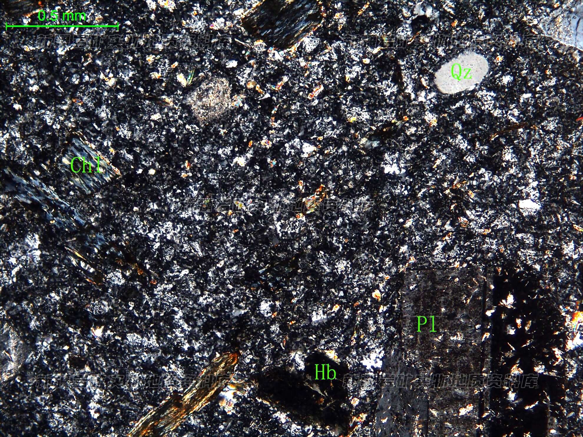 斑晶有半自形板状的更-中长石,长石表面有次生绢云母和细粒绿帘石;斑晶还有半自形柱状的角闪石,角闪石现多被绿泥石交代,但保留角闪石外形;斑晶还有半自形粒状的石英,石英外形呈浑圆状,石英具有熔蚀港湾外形。