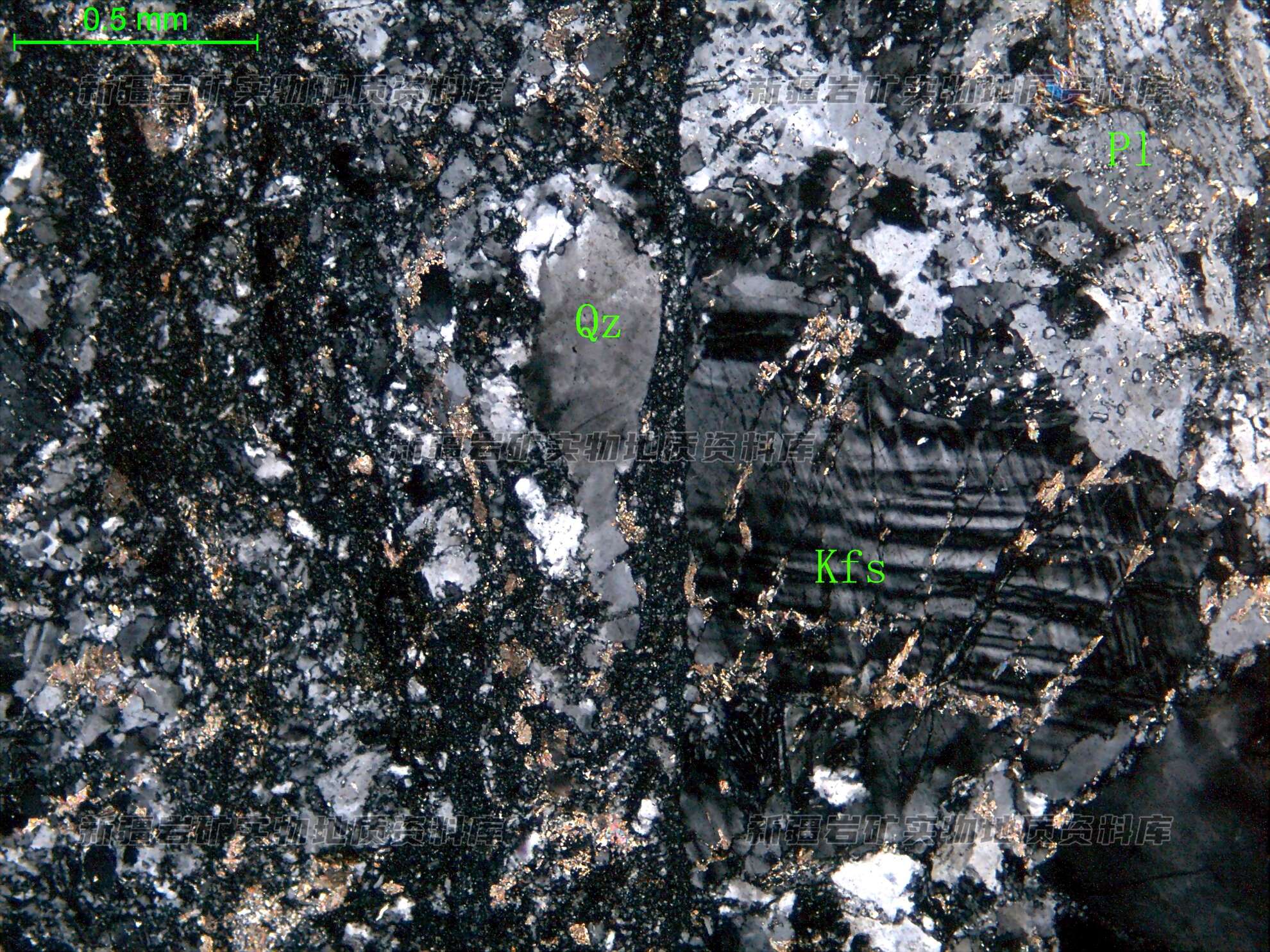 在更-中长石之间有半自形粒状的钾长石;在长石间有被压碎的石英,石英为不规则粒状;在长英矿物之间有次生方解石。