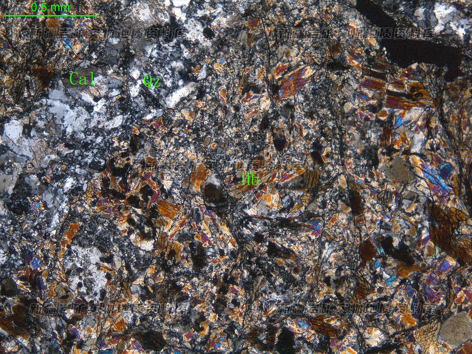 岩石特征描述: 岩石为接触变质带的产物,主要由半自形粒状的角闪石(Hb)组成。石英-方解石脉沿着破碎裂隙充填。