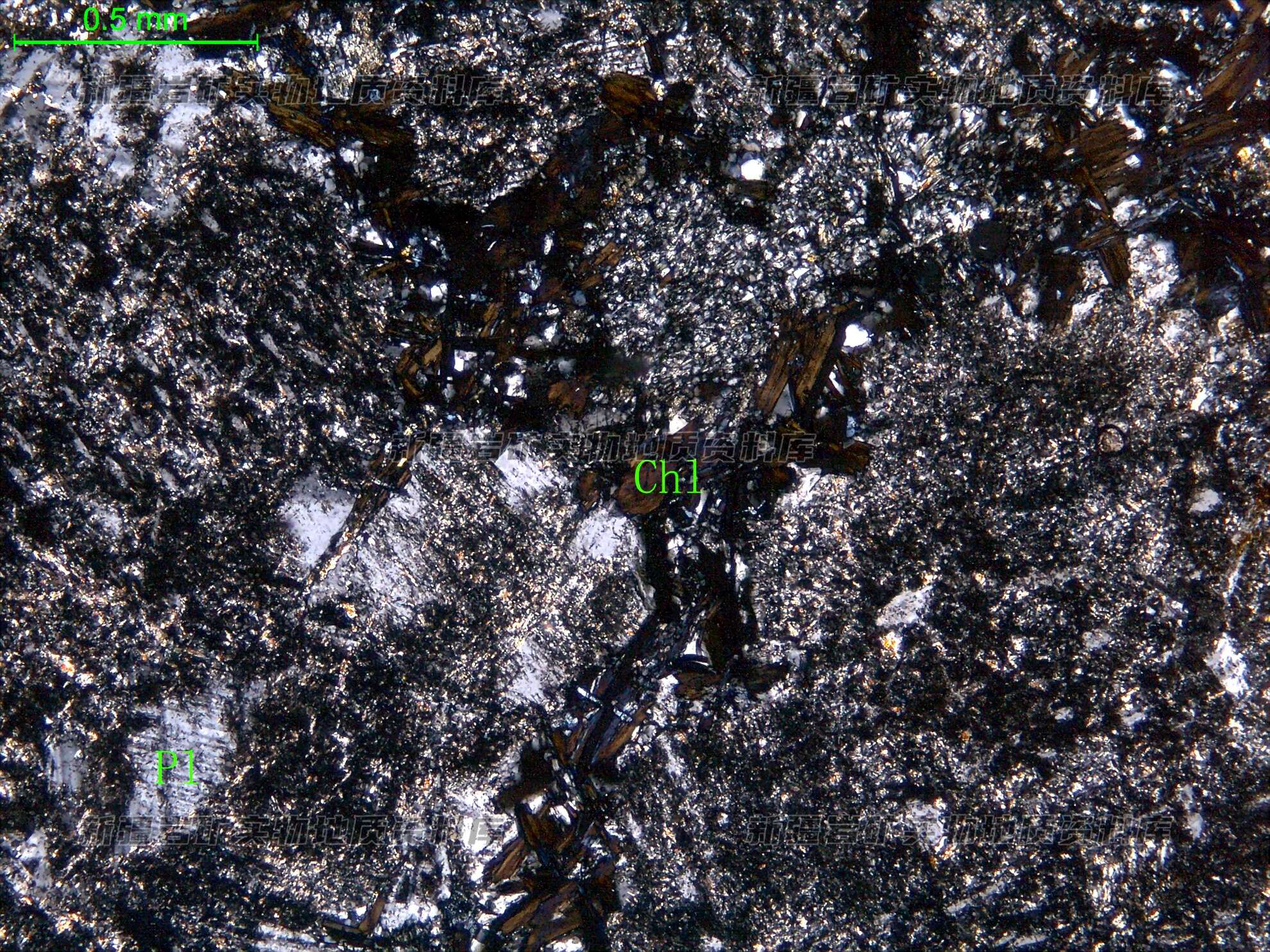 岩石特征描述: 更-中长石(Pl)半自形板状,表面见次生绢云母和细粒绿帘石;角闪石半自形柱状,受构造挤压,沿着裂隙分布,蚀变为绿泥石(Chl)片状集合体,其周边见微粒石英单晶。