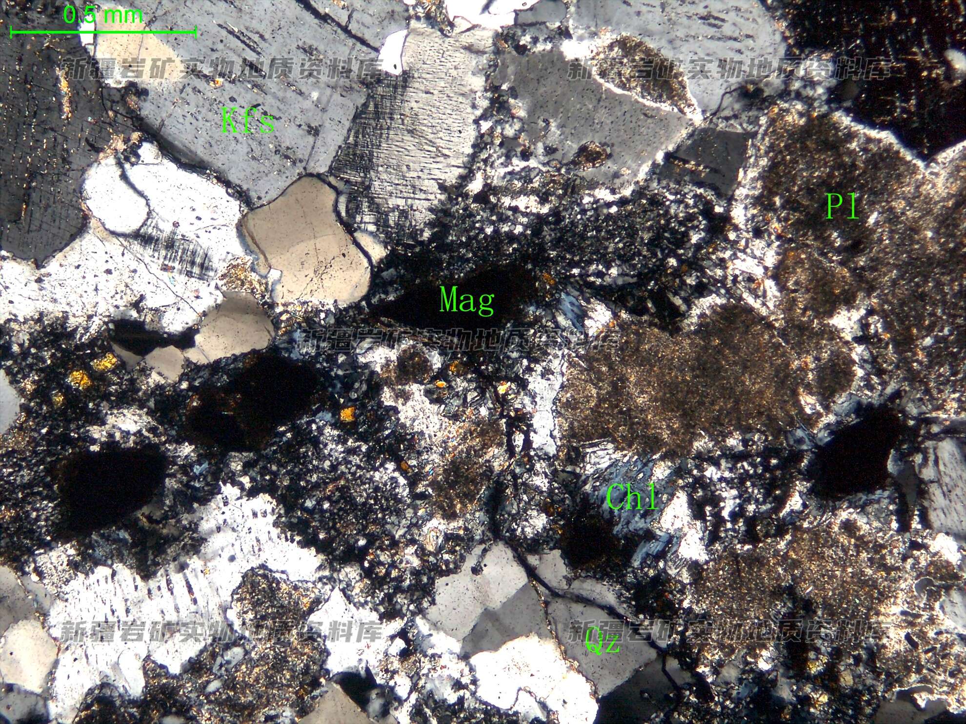 岩石特征描述: 角闪石定向分布,多被绿泥石(Chl)交代;在角闪石中包有半自形粒状的磁铁矿(Mag);更长石(Pl)半自形板状,表面强绢云母化;钾长石(Kfs)半自形板状,分布于更长石间并交代更长石;石英(Qz)为粒状变晶。