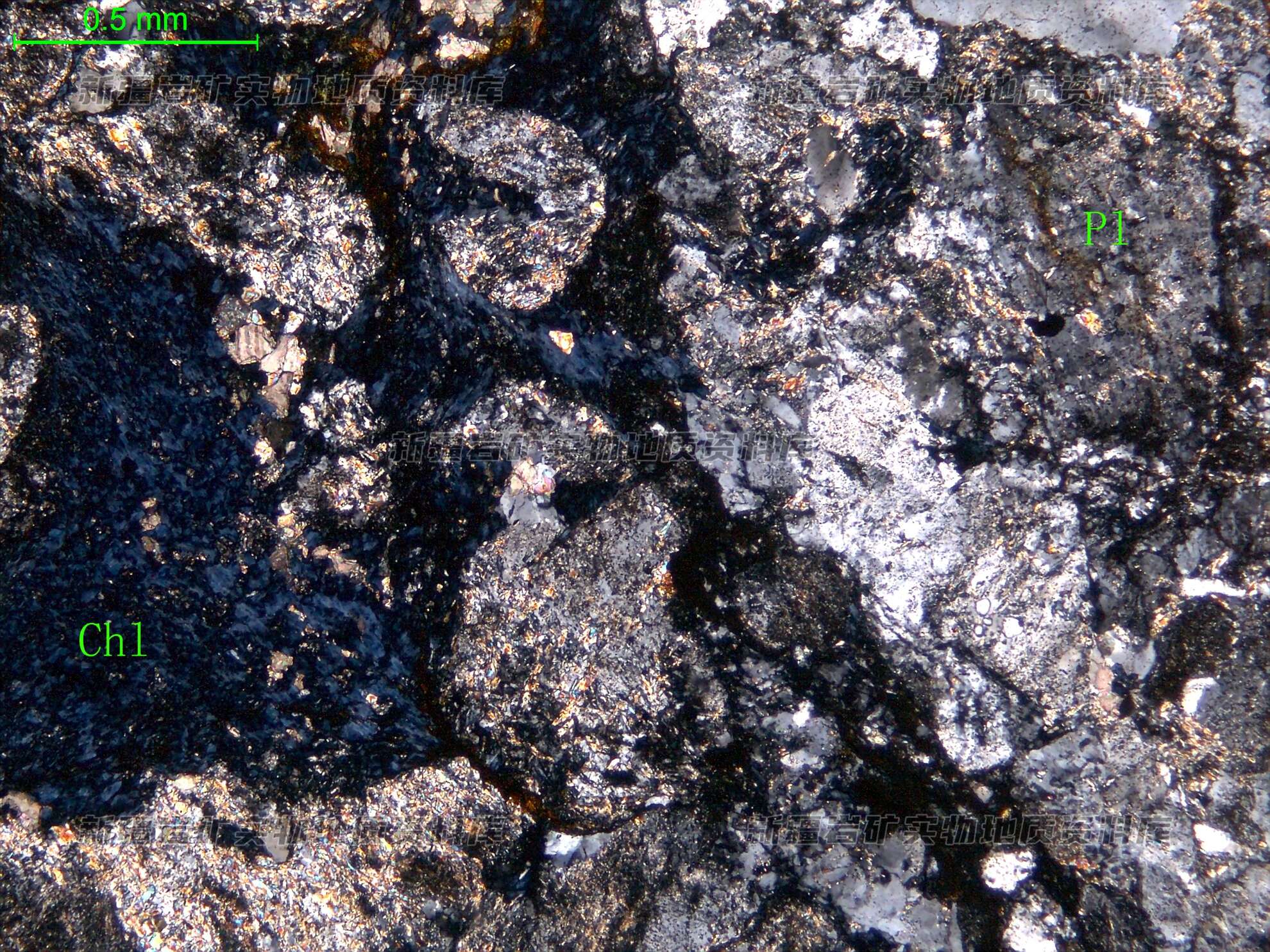 岩石有半自形板状的更-中长石,长石表面有次生绢云母和细粒绿帘石,长石受构造挤压边缘呈浑圆状;在长石间角闪石沿着更-中长石裂隙分布,现多蚀变为绿泥石。