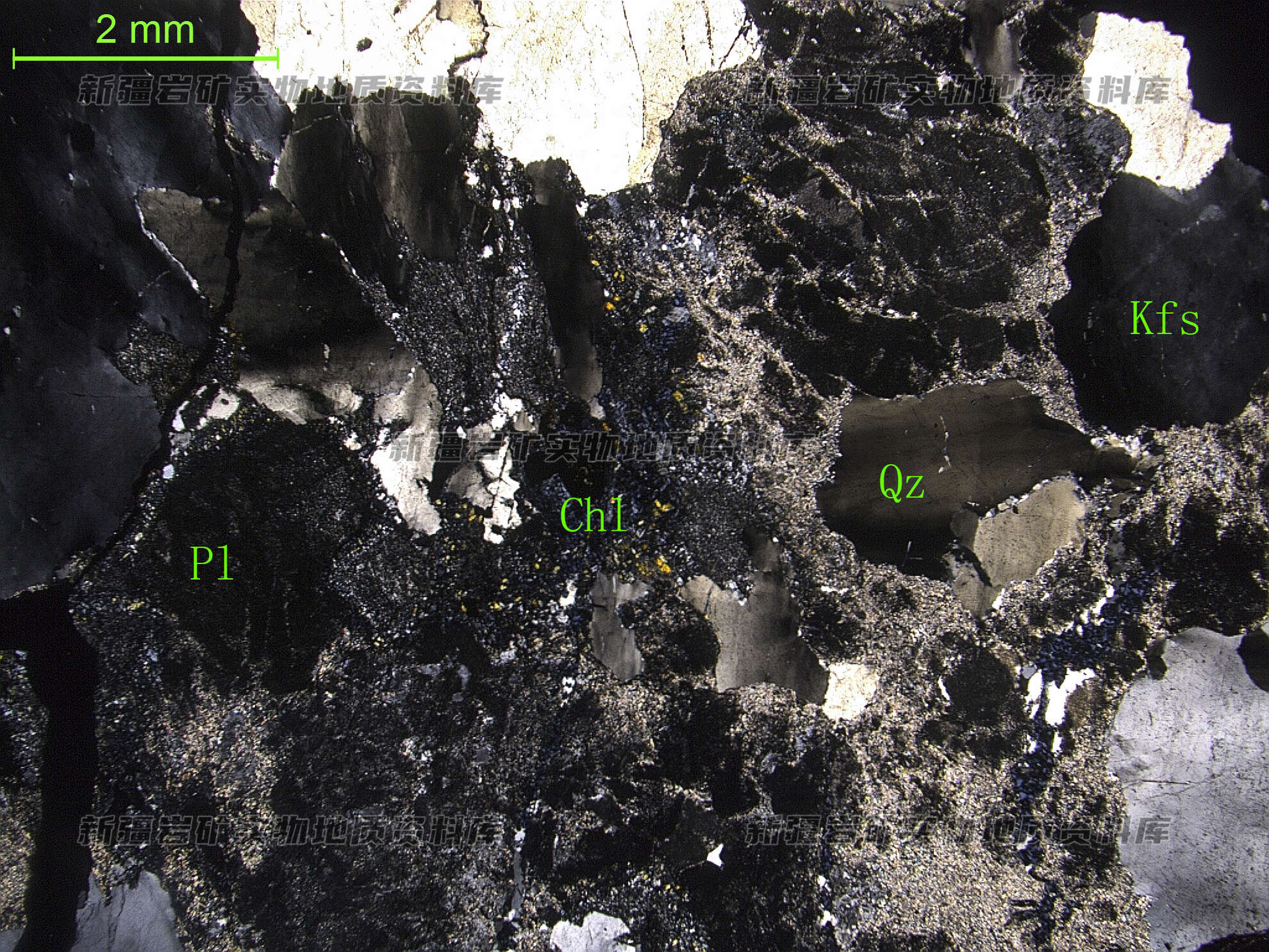 岩石特征描述: 更-中长石(Pl)半自形板状,绢云母化、绿帘石化;钾长石(Kfs)半自形板状,分布于更-中长石间并交代更-中长石;角闪石多被绿泥石(Chl)和绿帘石交代;石英(Qz)他形粒状,多波状消光。