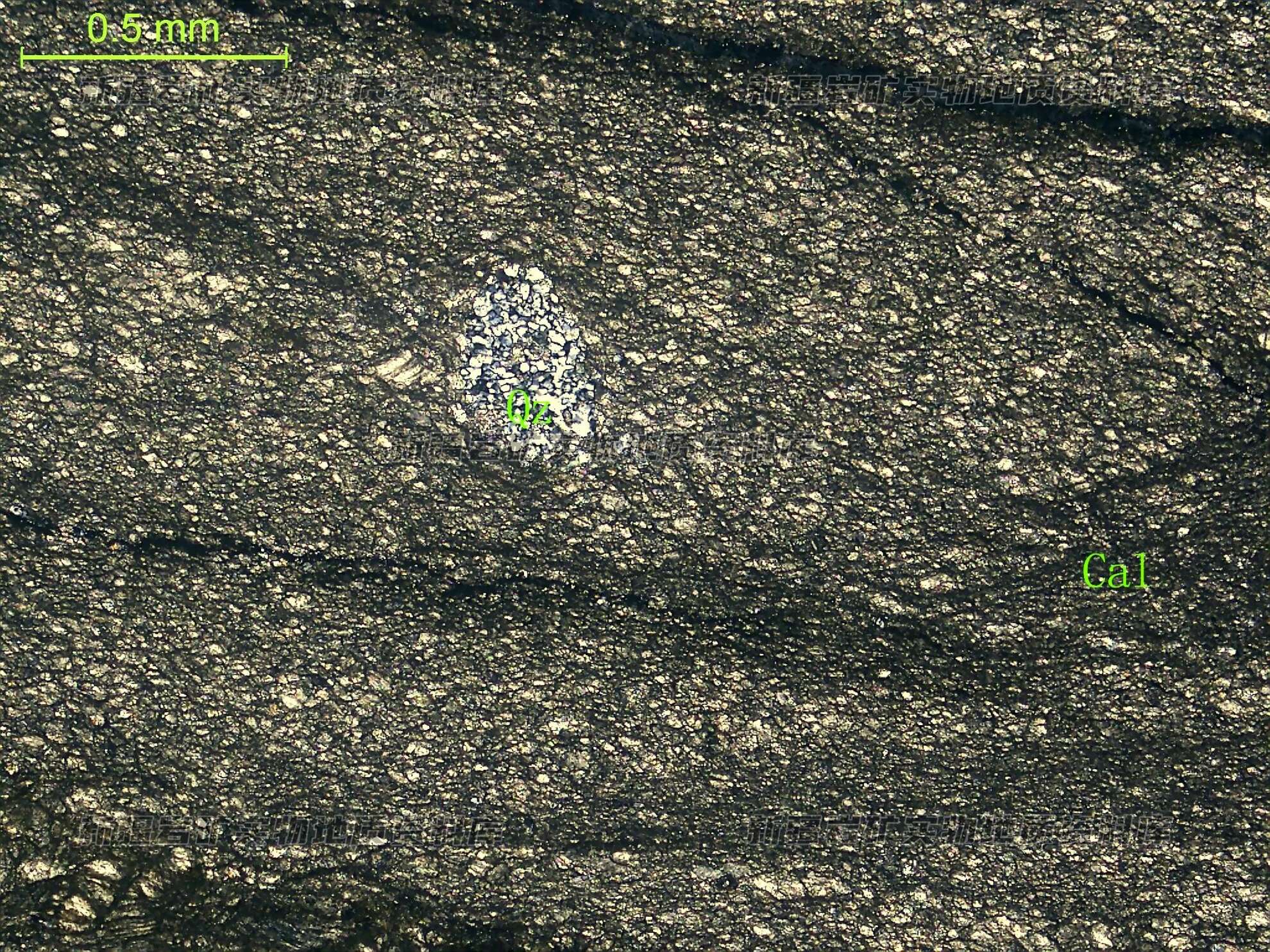 岩石特征描述: 岩石片理化,主要为粉晶方解石(Cal),在其集合体中见石英(Qz)。