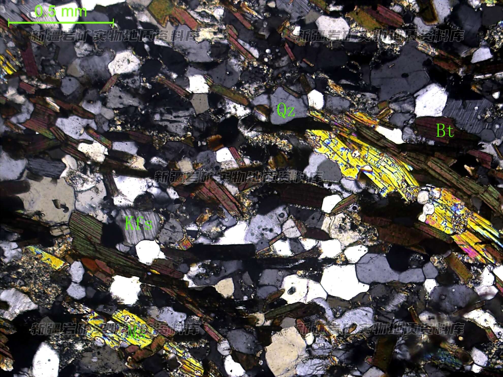 岩石特征描述: 岩石具片状构造。黑云母(Bt)沿着片理定向分布,在其边缘分布少量白云母(Ms);石英(Qz)表面多裂纹,波状消光;在石英(Qz)粒间分布半自形粒状的钾长石(Kfs)。