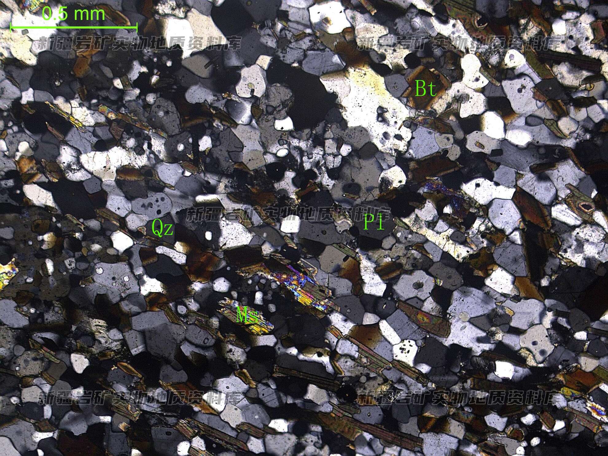 岩石特征描述: 岩石具片状构造。片状黑云母(Bt)沿着片理定向分布,在黑云母间分布少量白云母(Ms),片理间见石英(Qz)。