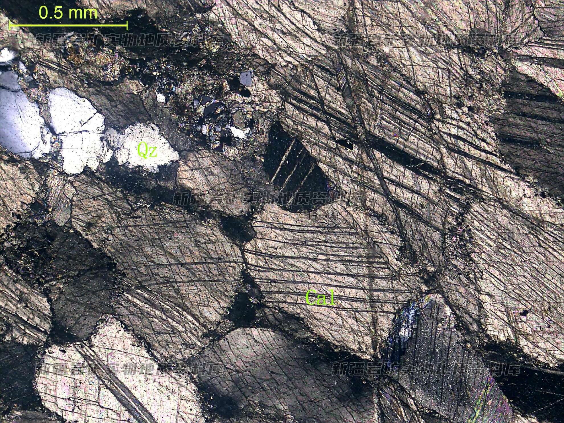 岩石特征描述: 粒状变晶的方解石(Cal)呈集合体状分布,在其集合体中分布粒状石英(Qz),石英多波状消光。