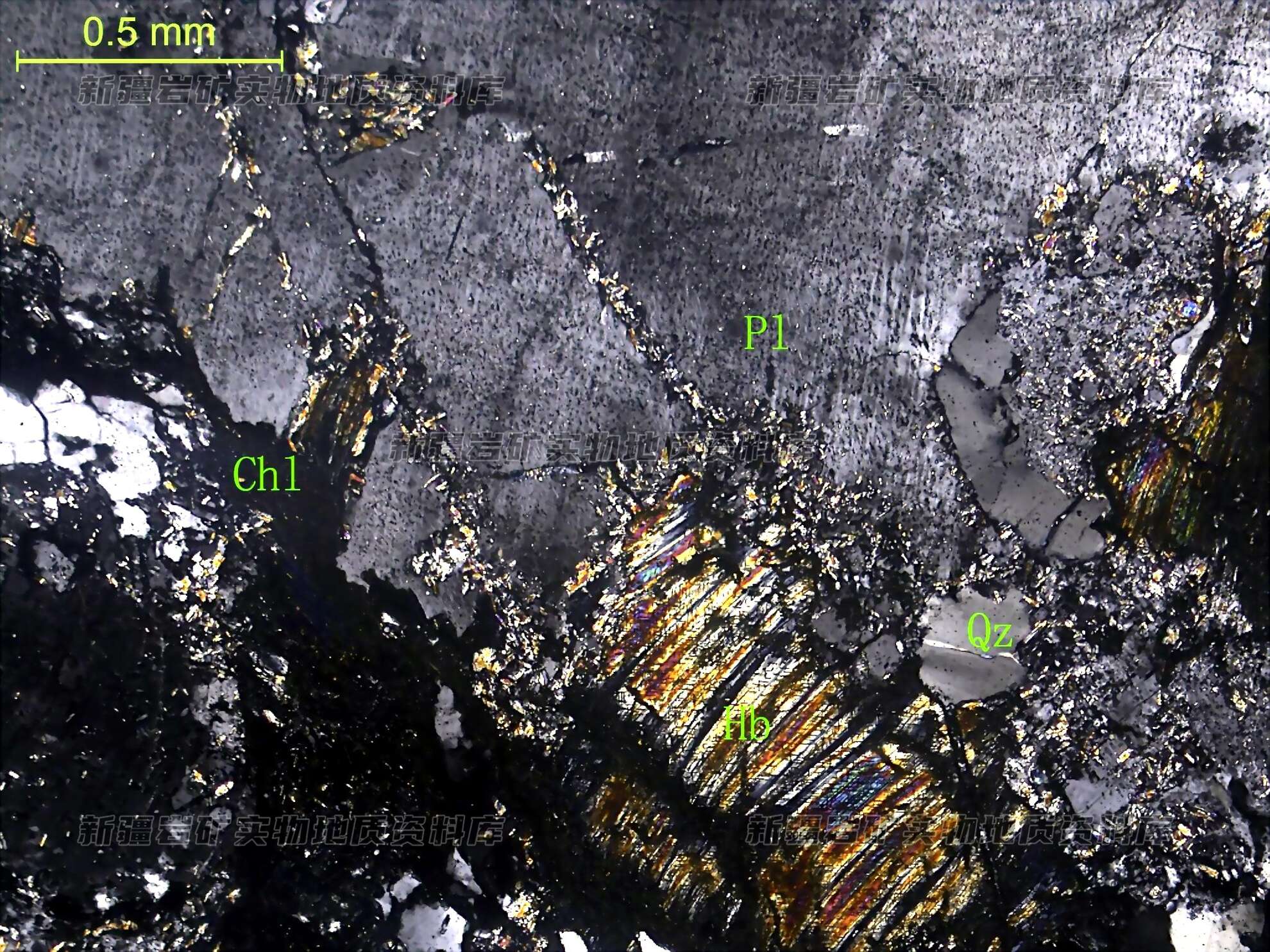 岩石特征描述: 更-中长石(Pl)半自形板状,绢云母化、绿帘石化;角闪石(Hb)半自形粒状,多被绿泥石(Chl)交代;磁铁矿半自形粒状,其边缘多蚀变为白钛石;石英(Qz)半自形粒状,分布于角闪石之间,多波状消光。