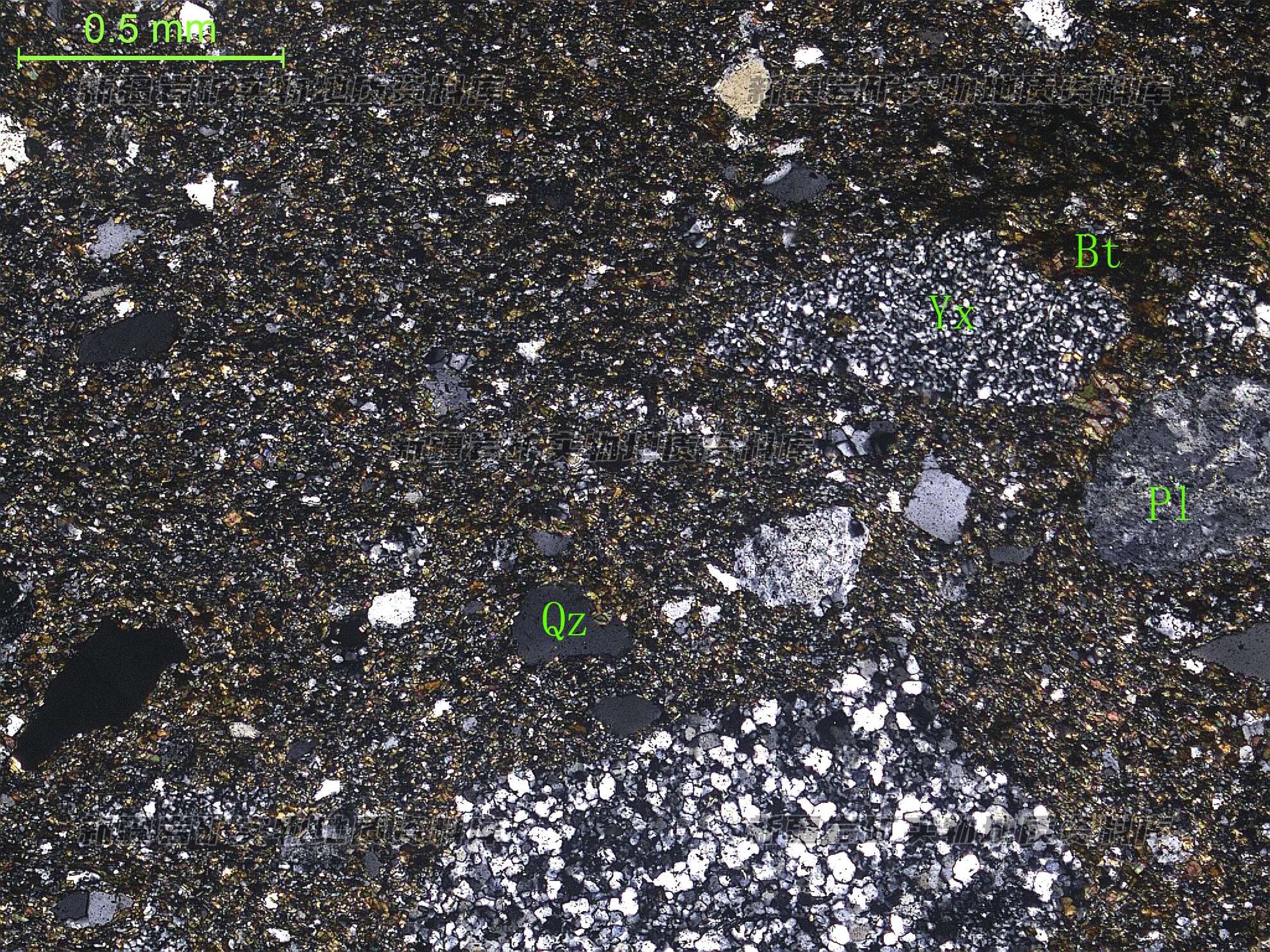 岩石特征描述: 碎屑次棱角状-次圆状,主要为石英(Qz)、长石和岩屑(Yx)。石英表面多裂纹,多波状消光;长石主要为斜长石(Pl);岩屑主要为硅质岩岩屑。填隙物泥质多蚀变为黑云母(Bt)。