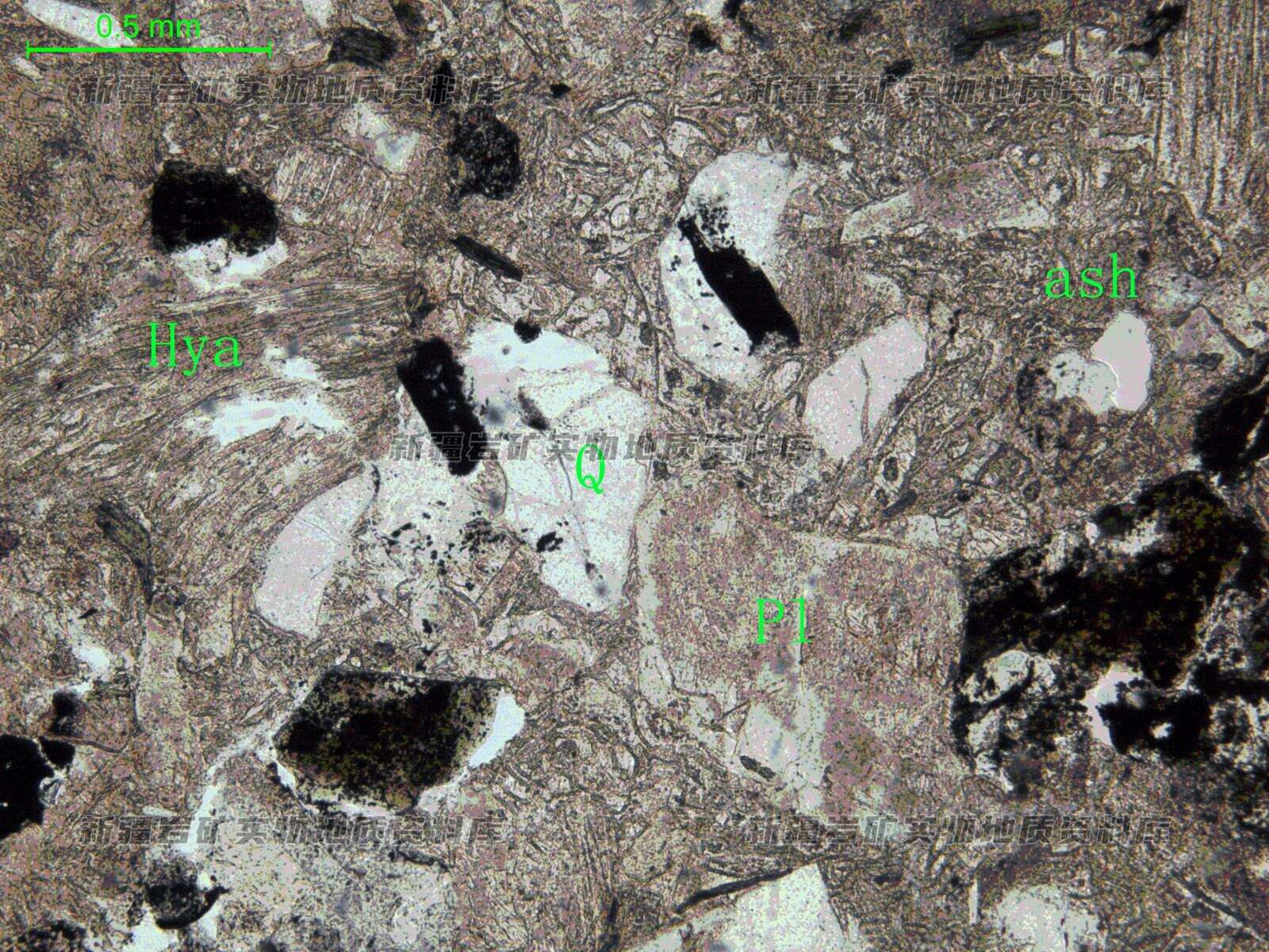 主要由晶屑、火山灰(ash)及少量玻屑(Hya)组成,晶屑有石英(Q)、斜长石(Pl)及角闪石,角闪石多已暗化。