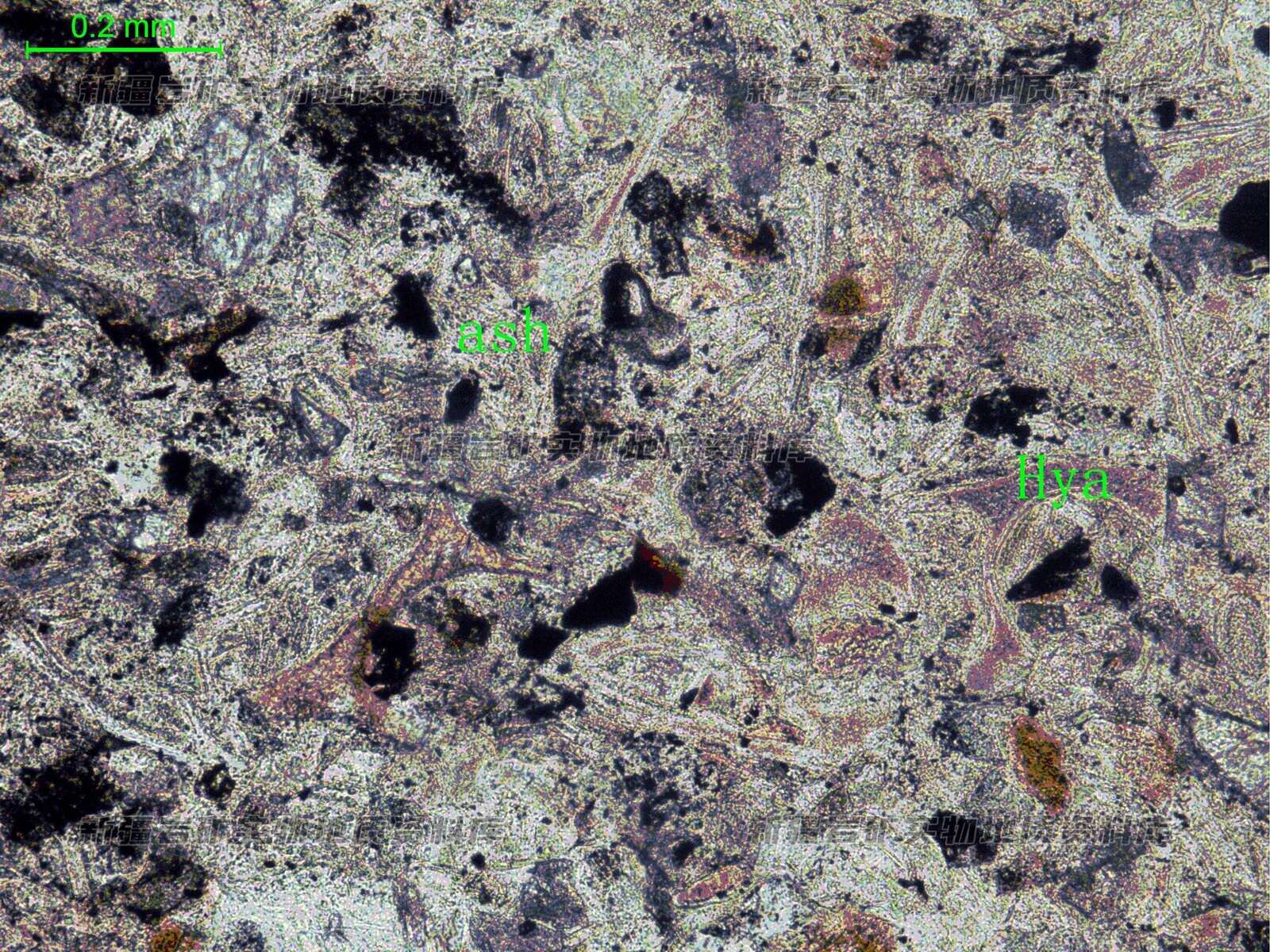 岩石主要由玻屑(Hya)和火山灰(ash)组成,玻屑呈鸡骨状不均匀分布,局部少量铁质不均匀分布。