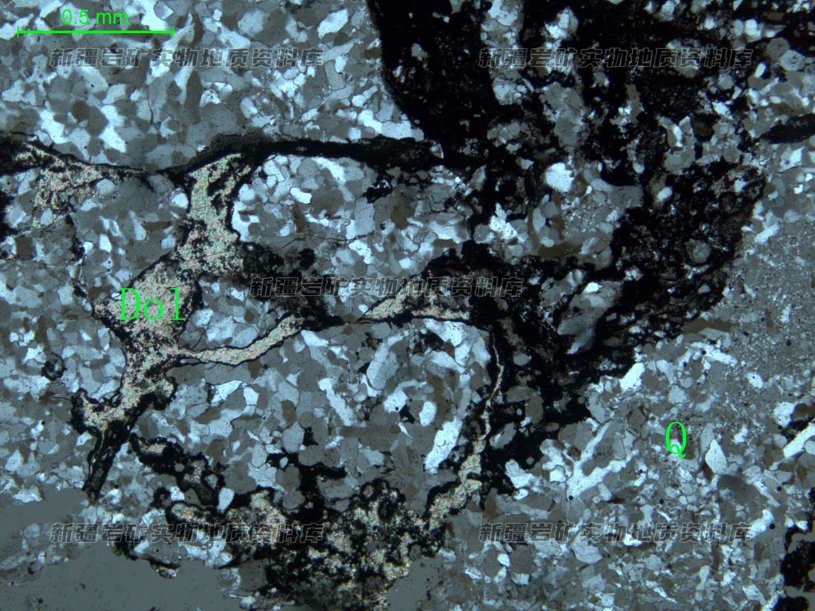 岩石主要由细粒石英(Q)组成,受构造挤压沿裂隙白云石(Dol)和铁质呈脉状充填