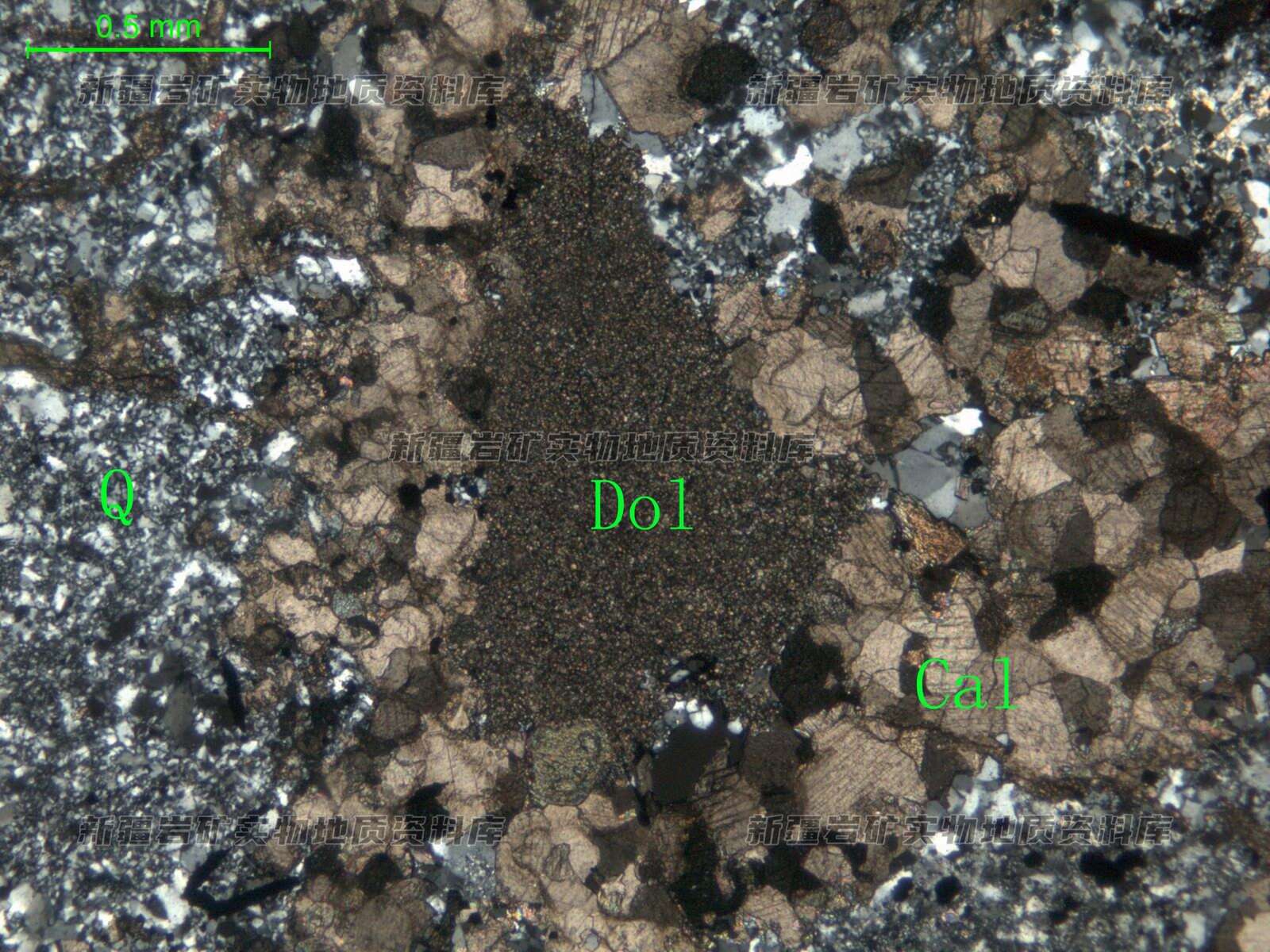 主要由隐晶质石英(Q)构成,局部隐晶质石英呈阴影状,在岩石孔洞中充填不规则状充填铁白云石(Dol)、方解石(Cal)团块
