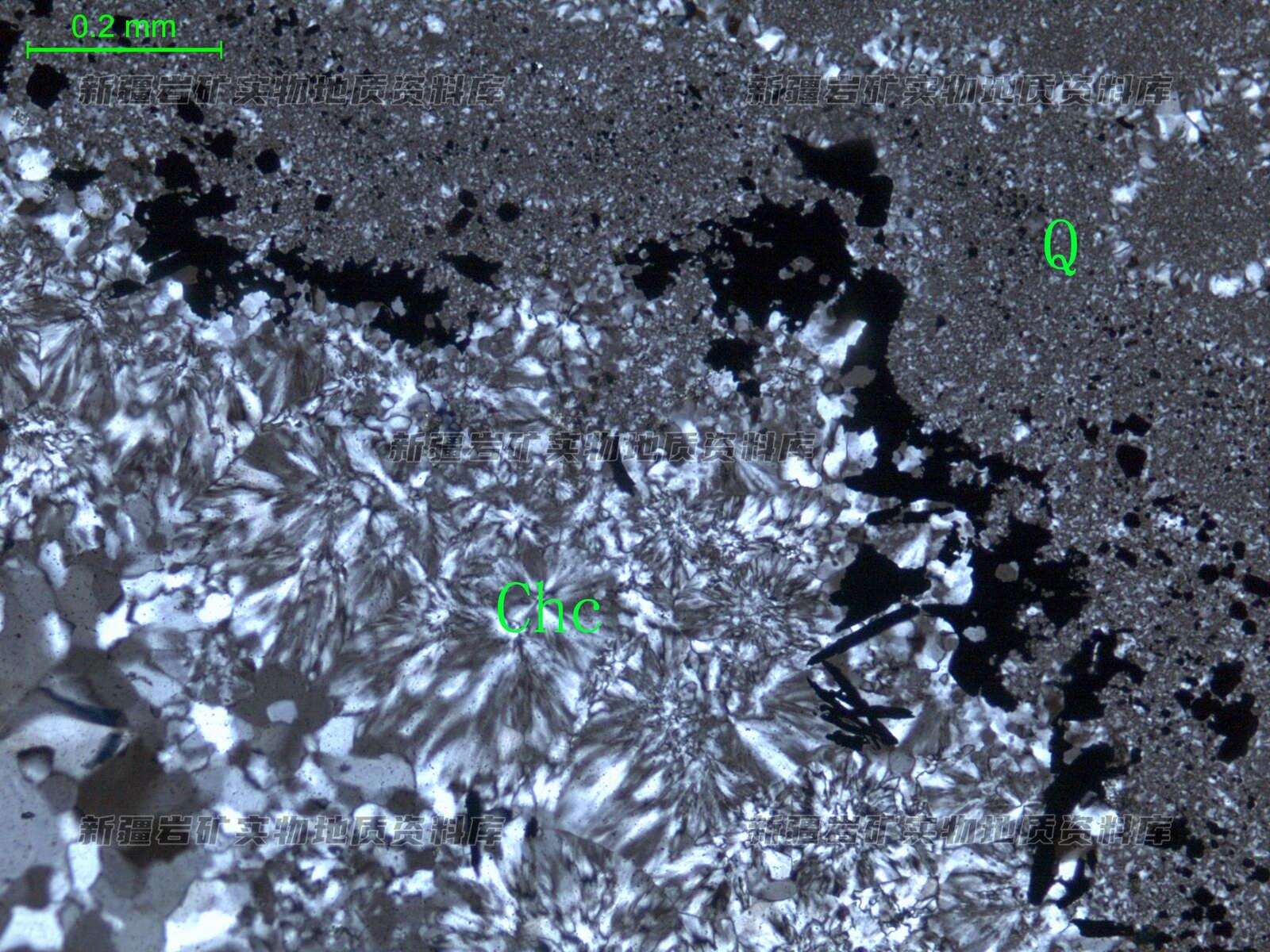 岩石主要由隐晶质石英(Q)组成,纤状玉髓(Chc)呈球粒状与粒状硫化物沿裂隙充填