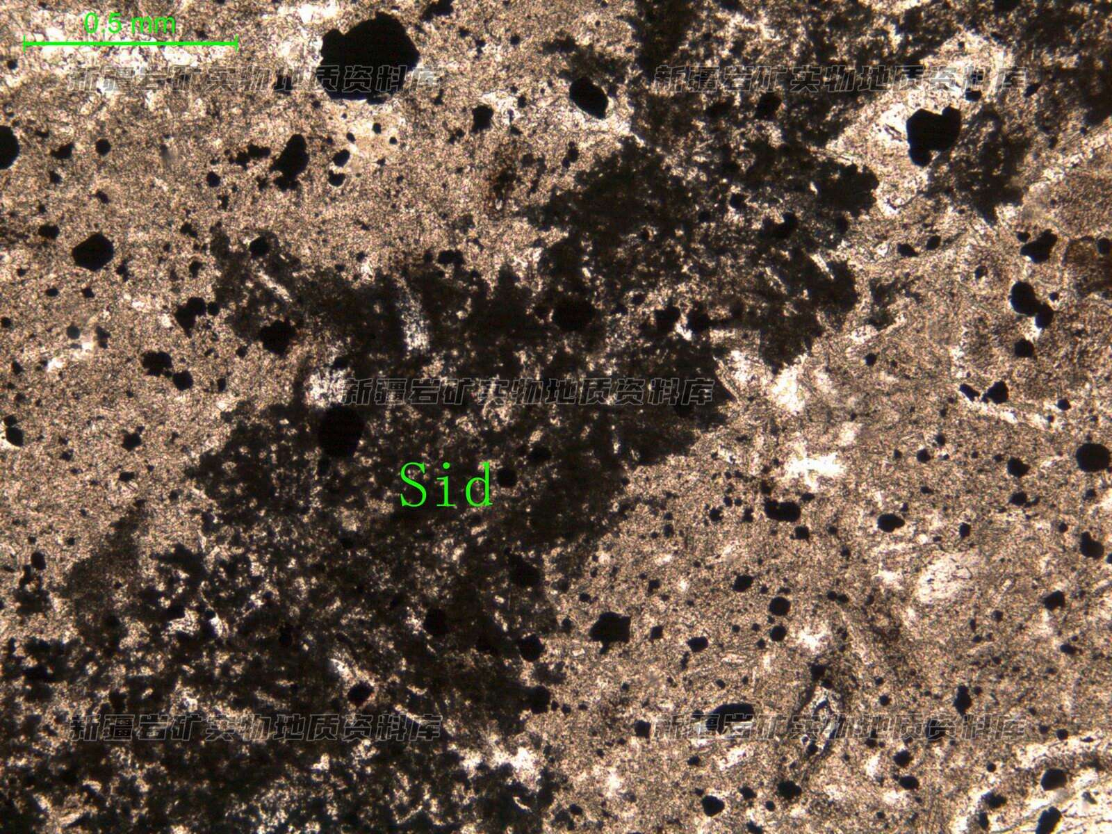 岩石残留原岩斜长石、角闪斑晶,保留石外形,菱铁矿(Sid)呈脉状穿过岩石