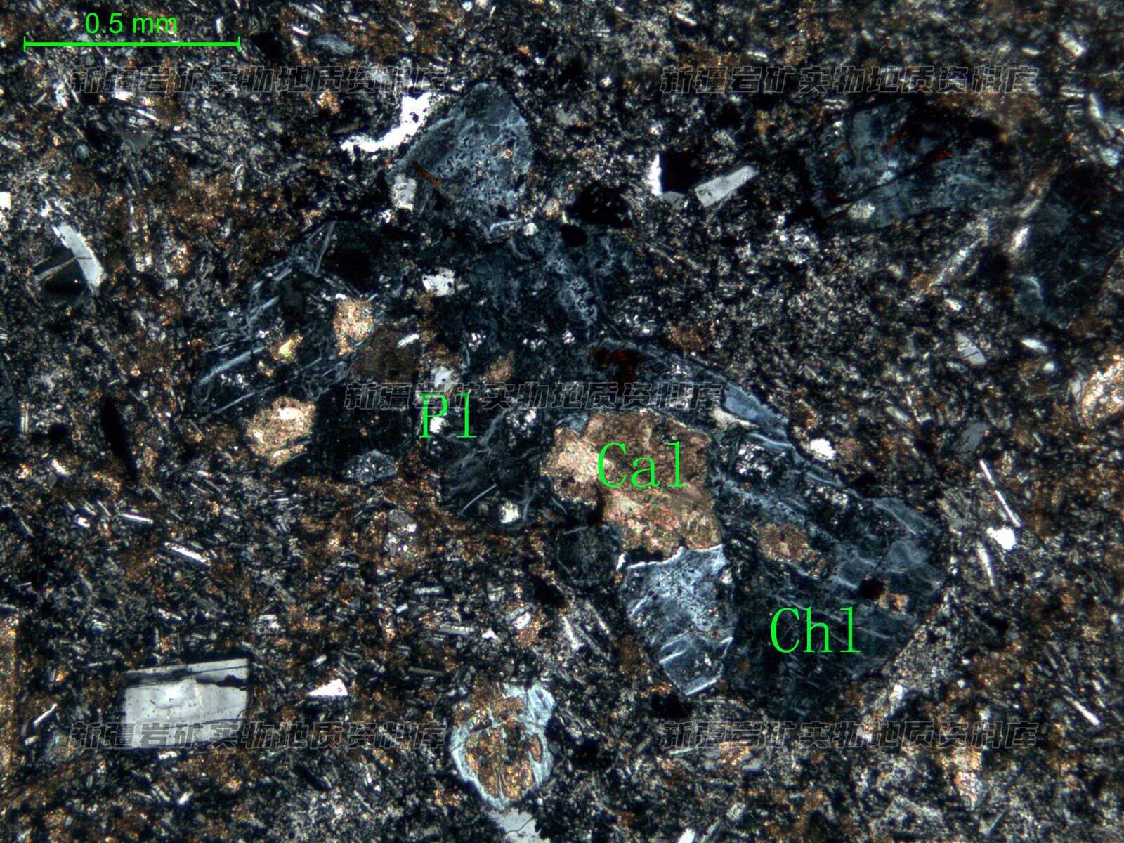 岩石蚀变强烈,斑晶斜长石(Pl)已蚀变为绿泥石(Chl)集合体和团状方解石(Cal)
