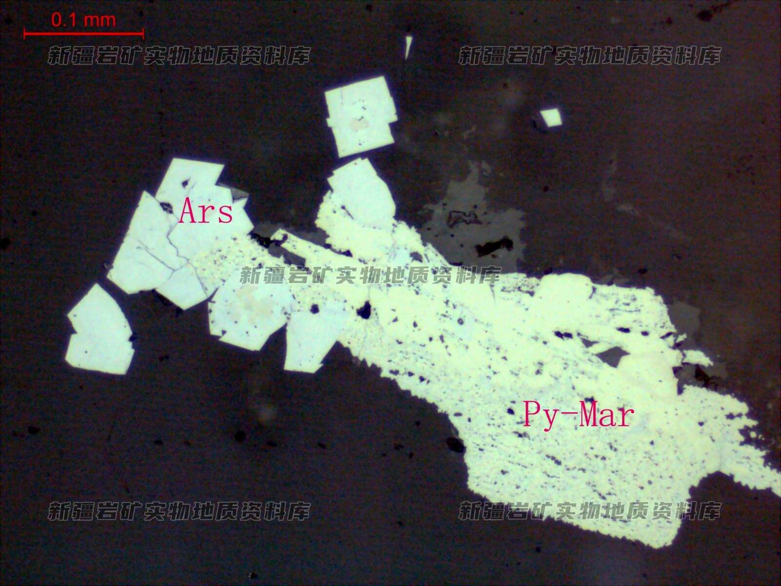 粒状黄铁矿-白铁矿(Py-Mar)集合体分布,边部与自形粒状毒砂(Ars)共生
