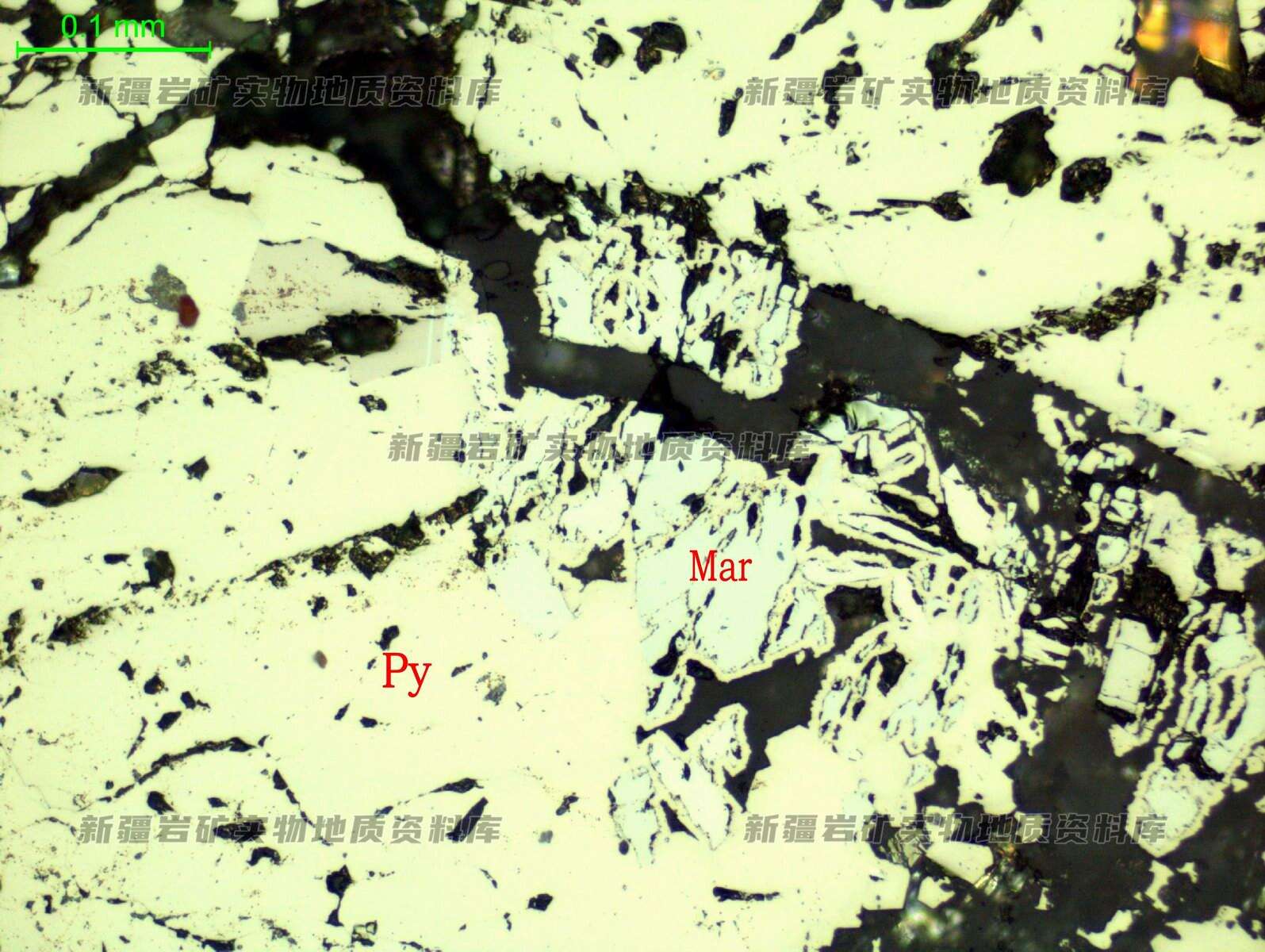 黄铁矿(Py)呈团块状集合体,局部见粒状白铁矿(Mar)边部有黄铁矿环边,被其交代