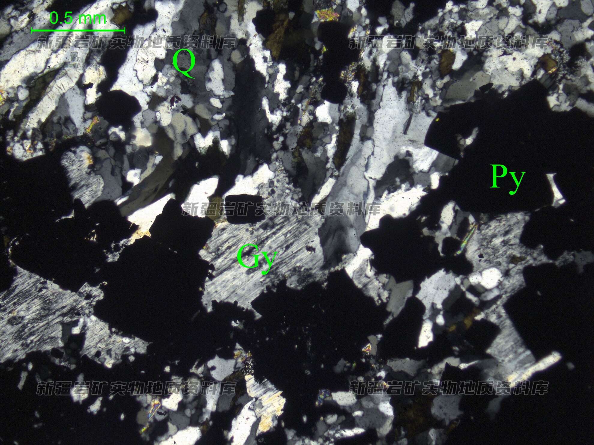岩石中的矿物主要为石英(Q)、黄铁矿(Py)及少量石膏(Gy)构成,可见自然金。石英他形粒状集合体,黄铁矿半自形-他形粒状,分布在石英粒间。