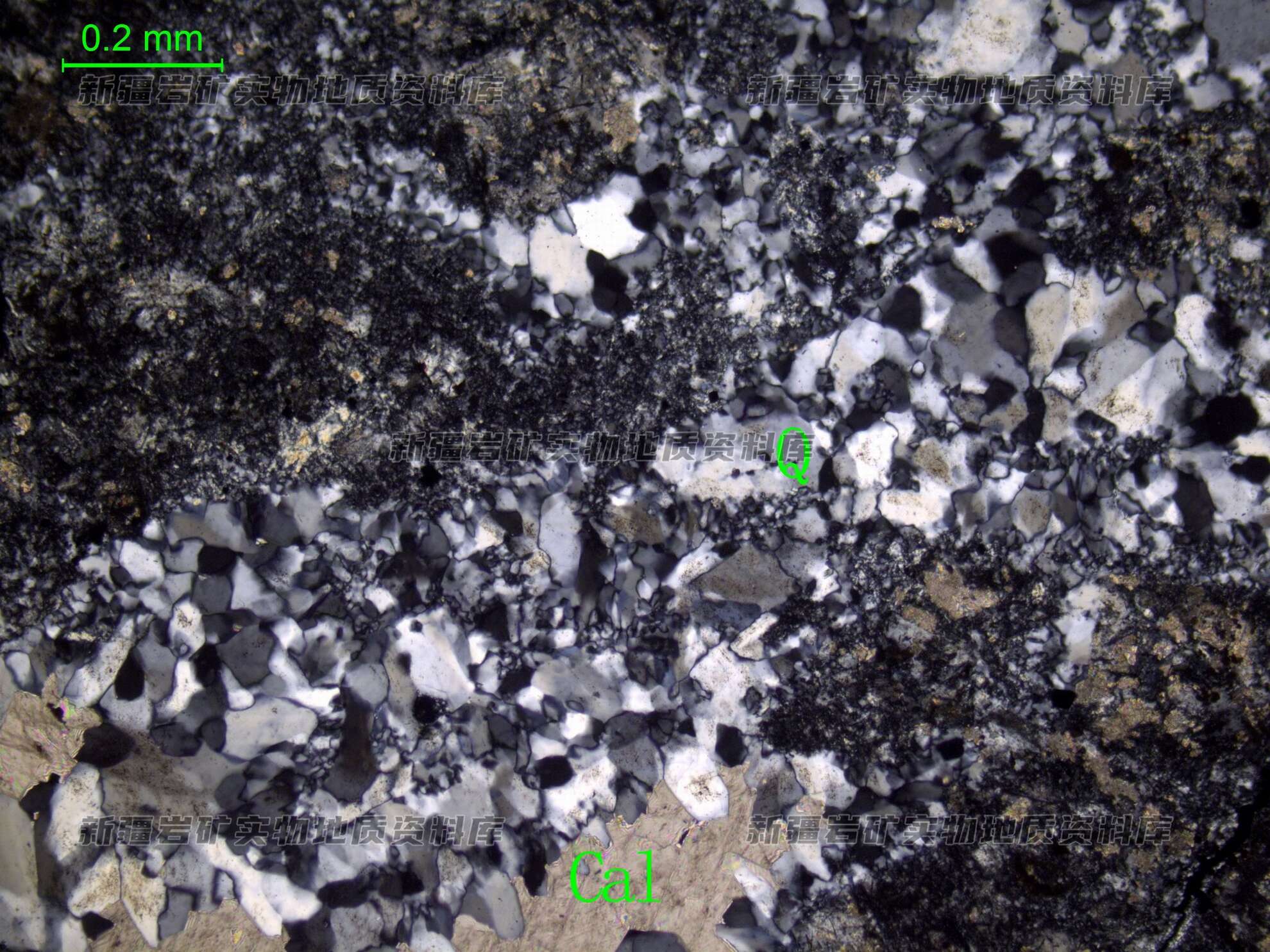 次生石英(Q)、方解石(Cal)沿裂隙充填交代,产生硅化及方解石化。