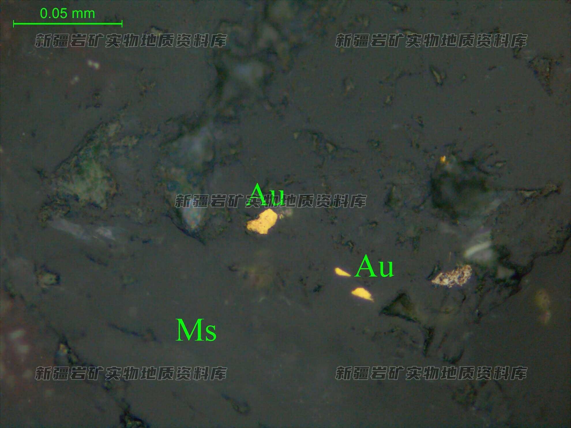 自然金(Au)半自形-他形粒状,粒径在0.005-0.02 mm±,分布在脉石矿物(Ms)粒间。