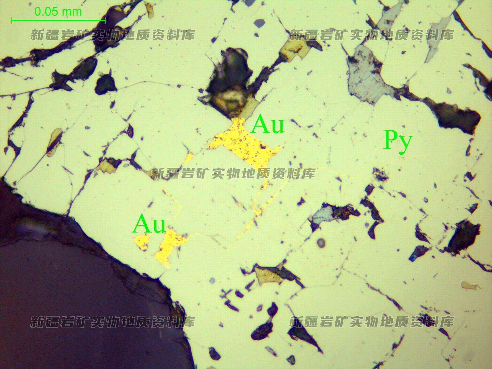 自然金(Au)他形粒状,粒径在0.005-0.04 mm±,分布在黄铁矿(Py)之中或在其裂隙中。
