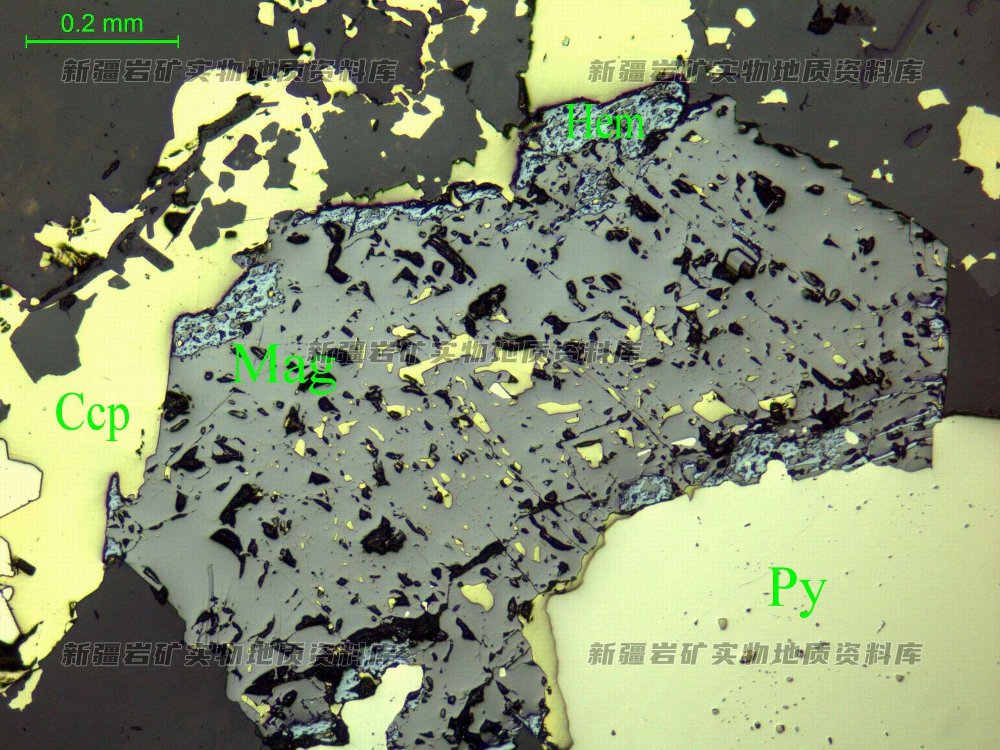 金属矿物为磁铁矿(Mag)、黄铁矿(Py)、黄铜矿(Ccp)及赤铁矿(Hem),分布在脉石矿物(Ms)粒间,赤铁矿交代磁铁矿,磁铁矿被黄铜矿穿孔交代。