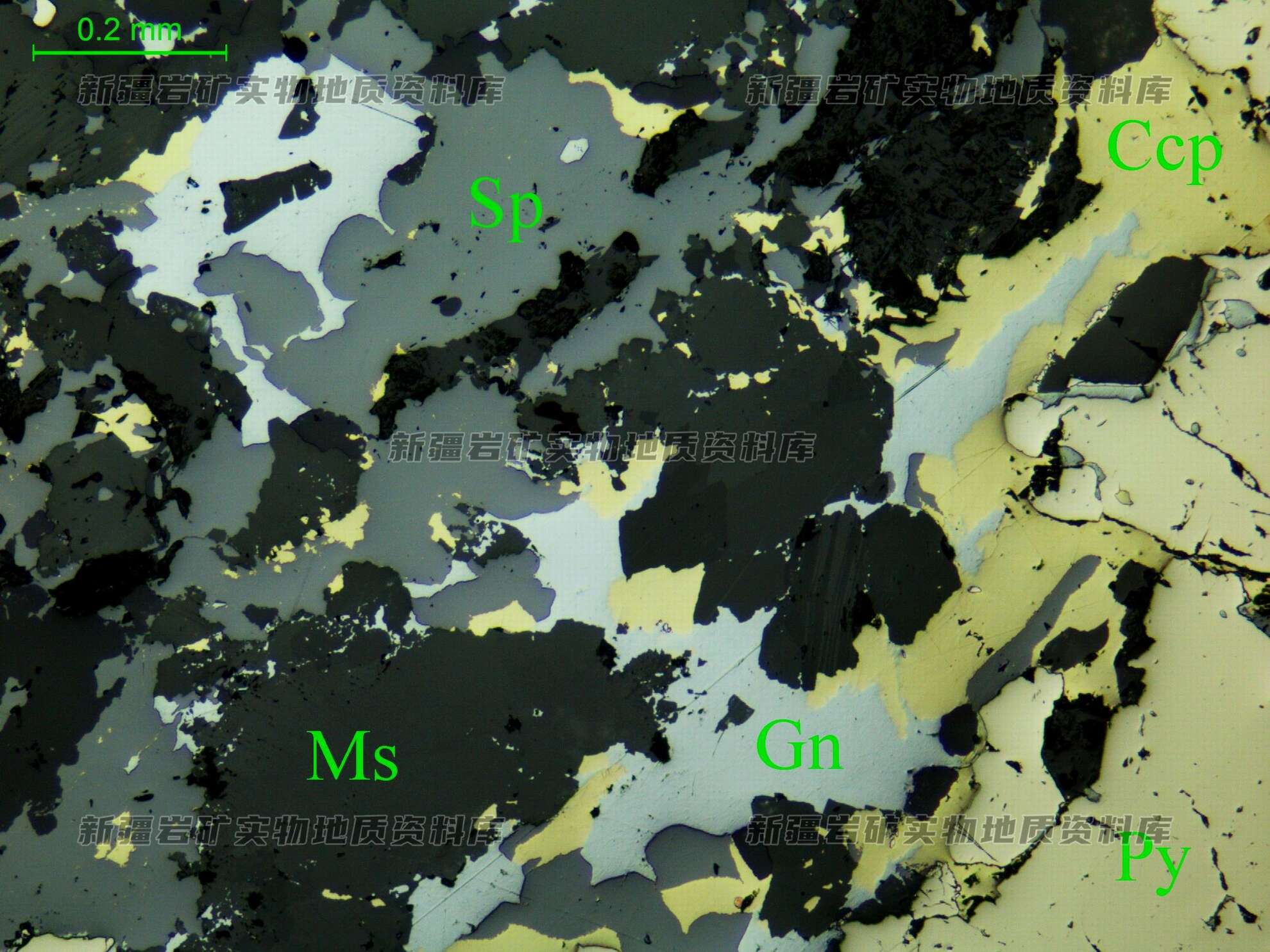 金属硫化物为黄铜矿(Cp)、闪锌矿(Sph)、方铅矿(Gn)及黄铁矿(Py),彼此连生在一起。