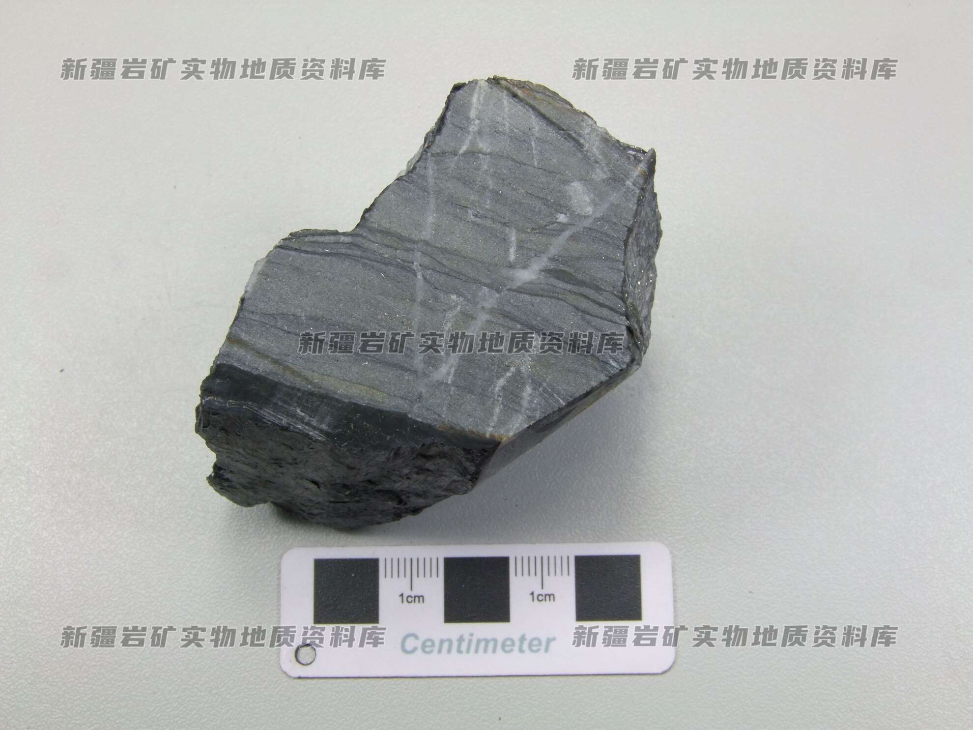 岩石具变余粉砂状结构,其中夹炭质条带,石英脉垂直穿过层理。