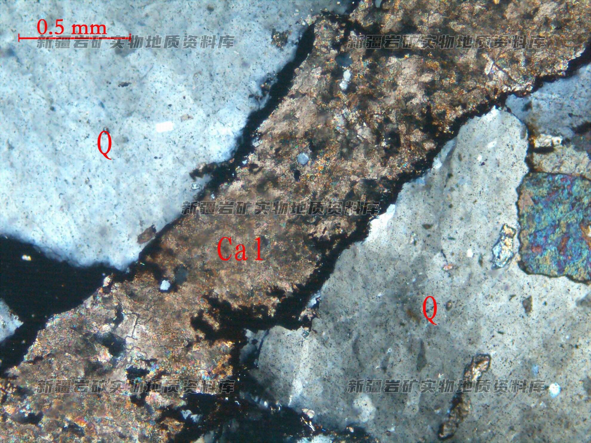 在早期的石英(Q)脉中分布后期贯入的方解石(Cal)脉。