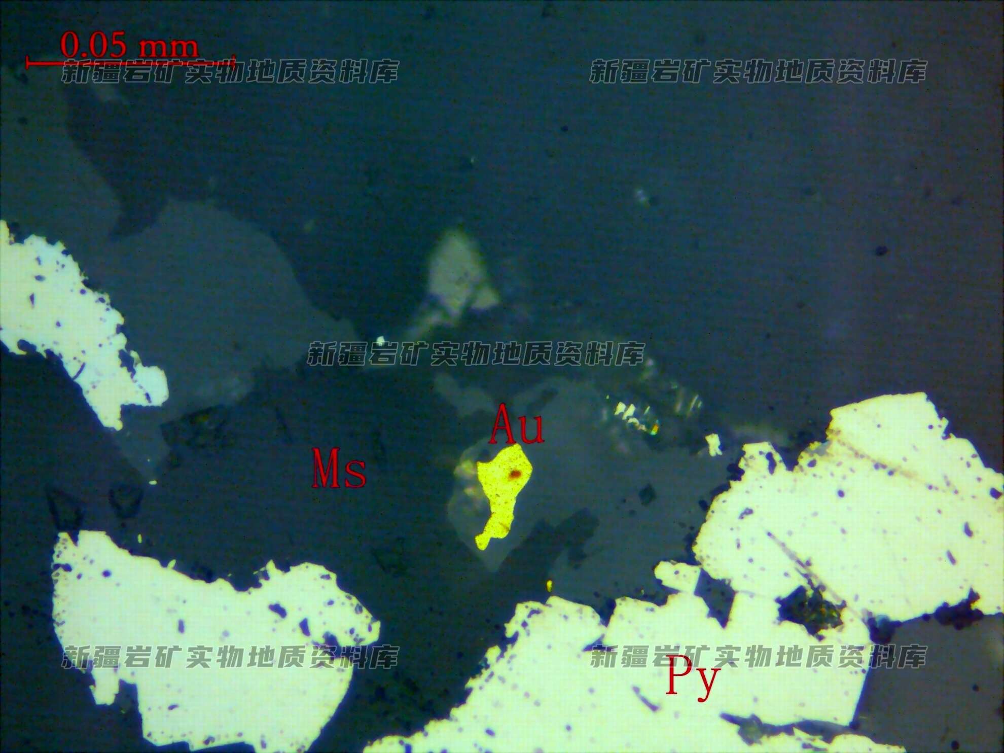 他形粒状含银自然金(Au)分布在脉石矿物(Ms)粒间,与黄铁矿(Py)伴生。