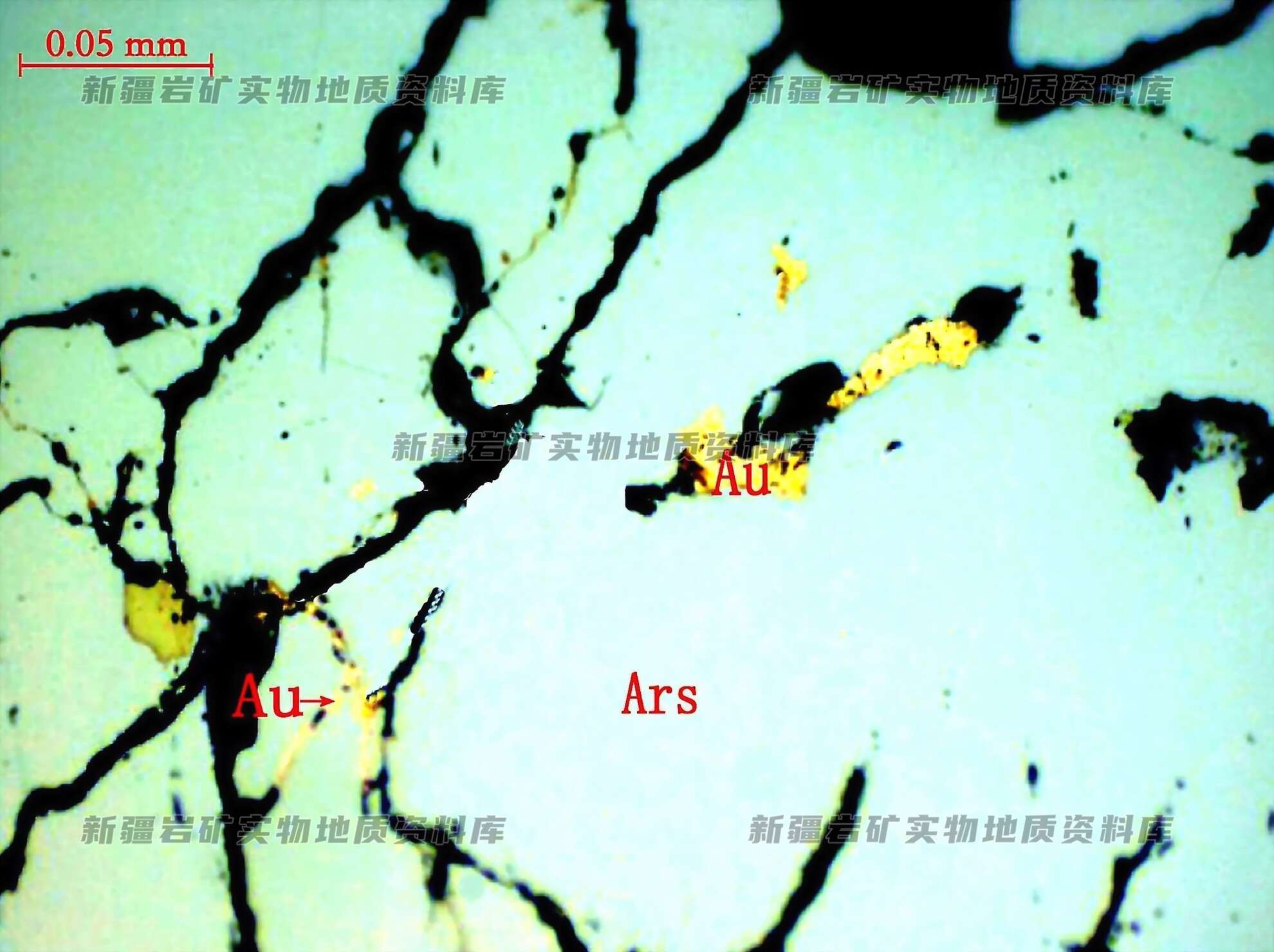 他形粒状自然金(Au)单独包裹于毒砂(Ars)中,见微细粒自然金产于毒砂裂隙中。