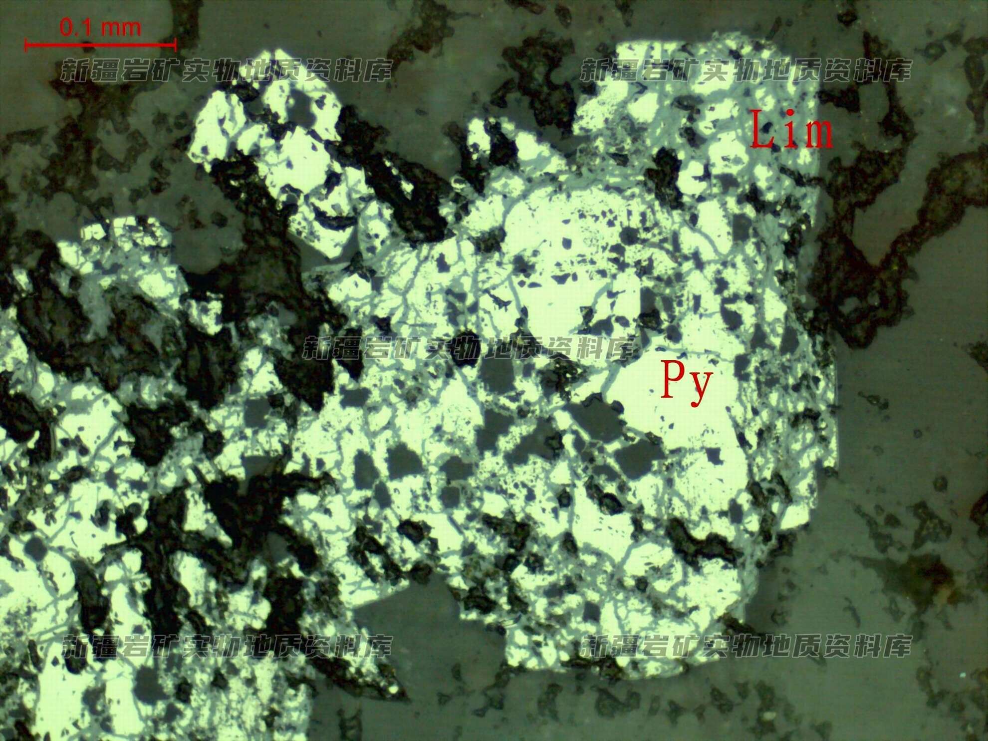 交代假象结构,黄铁矿具碎裂结构,黄铁矿(Py)被次生褐铁矿(Lim)沿边缘或裂隙交代,保留黄铁矿外形。