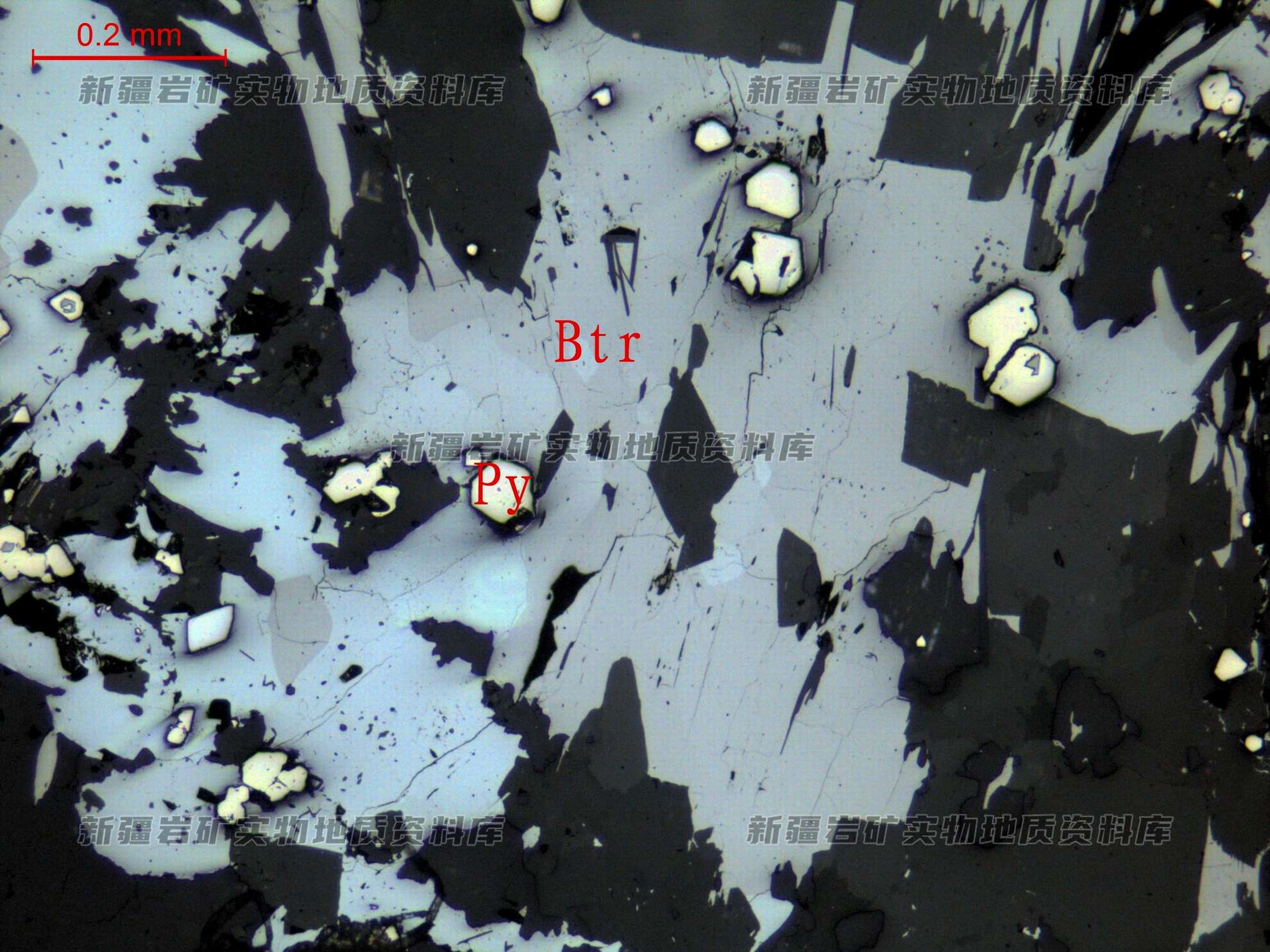 他形粒状辉锑铁矿(Btr)与粒状黄铁矿(Py)连生,分布石英脉中。