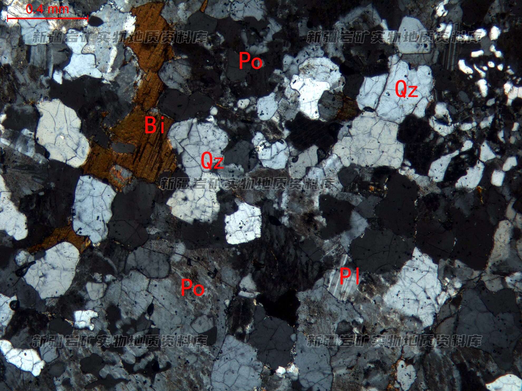 岩石特征描述: 岩石主要由钾长石(Po)、石英(Qz)、斜长石(Pl)及黑云母(Bi)等构成。钾长石为条纹长石,表面具泥化现象。斜长石为更长石,半自形粒状。石英他形粒状,分布在长石粒间,少量与钾长石呈文像交生。