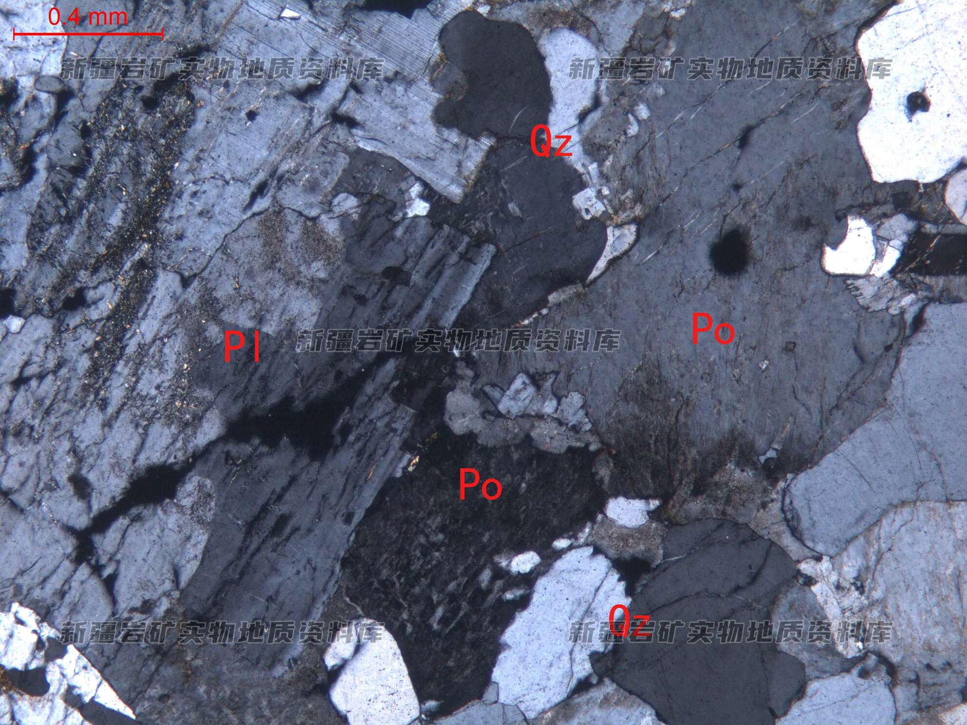 岩石特征描述: 岩石主要由钾长石(Po)、石英(Qz)、斜长石(Pl)及少量黑云母等构成。钾长石为条纹长石,他形粒状,表面具泥化现象。斜长石为更长石,半自形粒状、板状。石英他形粒状,分布在长石粒间。