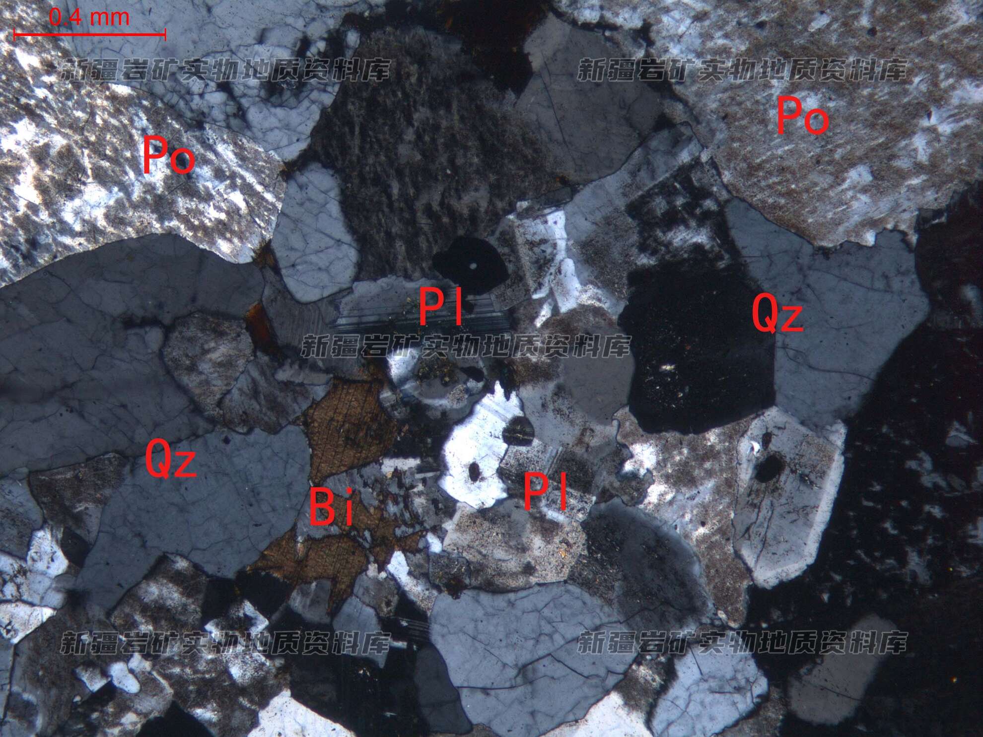 岩石特征描述: 岩石由钾长石(Po)、石英(Qz)、斜长石(Pl)及少量黑云母(Bi)构成。钾长石为条纹长石,他形粒状,表面具泥化现象。石英他形粒状,分布在长石粒间。斜长石为更长石,半自形板状分布。黑云母片状,分布在长石、石英粒间。