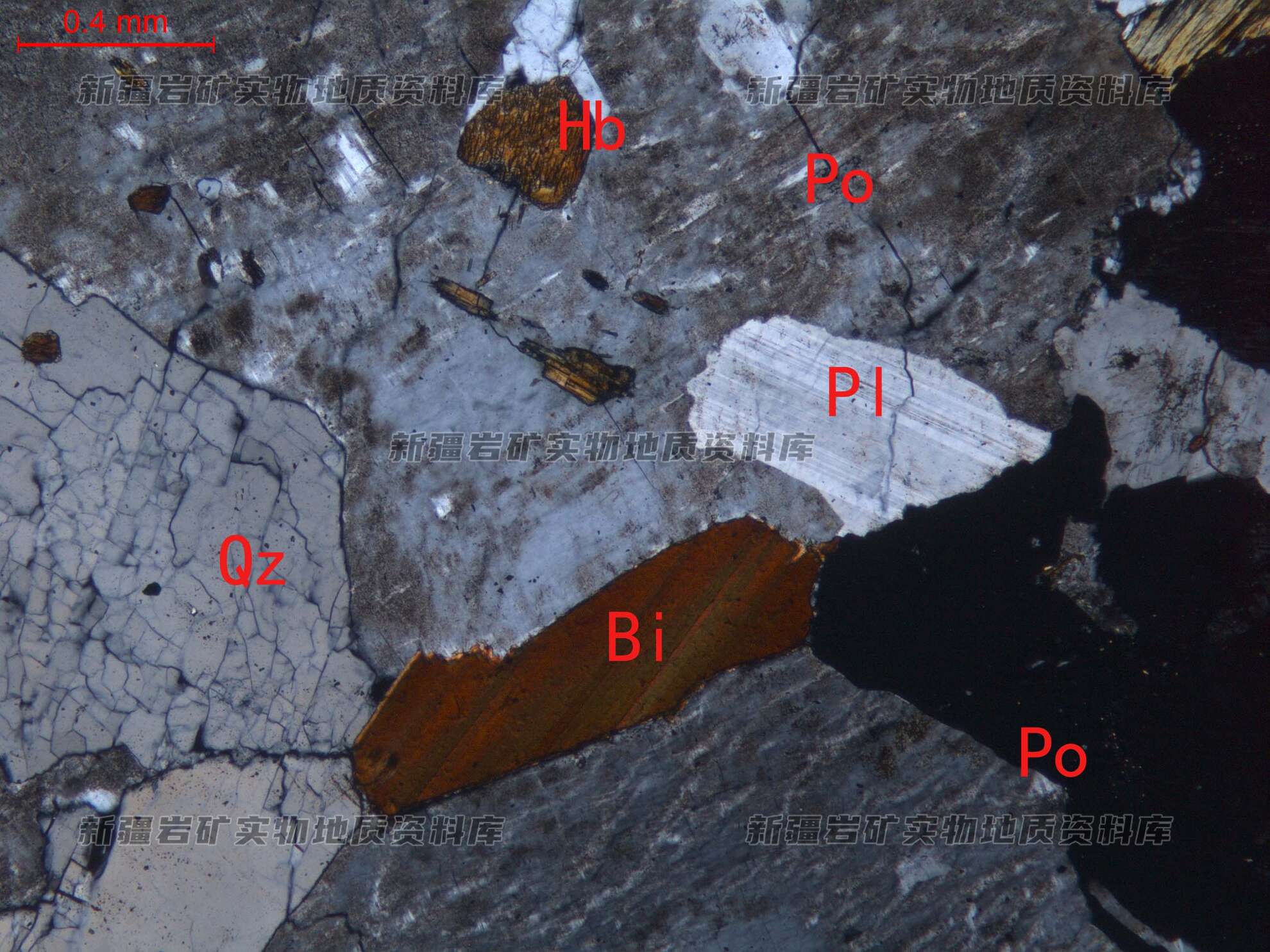 岩石特征描述: 岩石主要由钾长石(Po)、石英(Qz)、斜长石(Pl)及少量黑云母(Bi)构成。钾长石为条纹长石,他形粒状,表面具泥化现象。石英他形粒状,分布在长石粒间。斜长石为更长石,半自形板状,与钾长石连生。