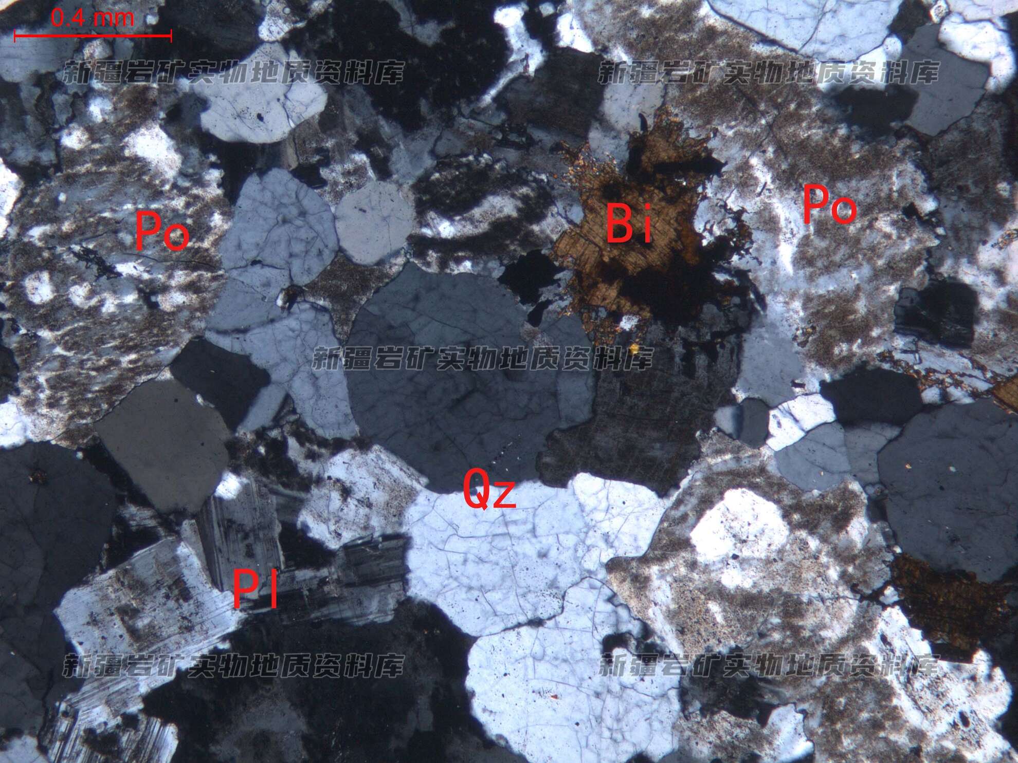 岩石特征描述: 岩石主要由钾长石(Po)、石英(Qz)及少量斜长石(Pl)、黑云母(Bi)构成。钾长石为条纹长石,他形粒状,表面具泥化现象。石英他形粒状,分布在长石粒间。斜长石为更长石,半自形粒状、板状,分布在其他透明矿物粒间。