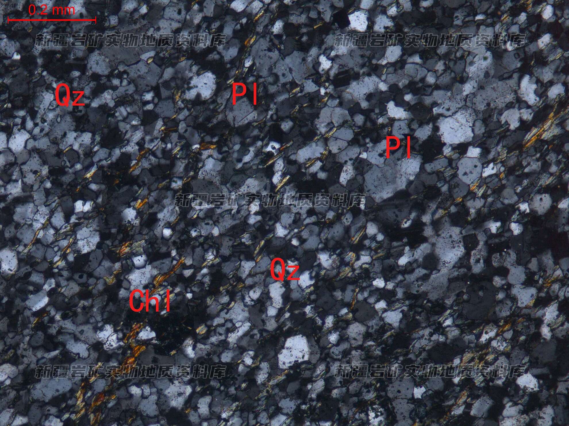 岩石特征描述: 岩石主要由重结晶形成的绿泥石(Chl)、石英(Qz)及斜长石(Pl)集合体构成,沿延长方向定向分布。
