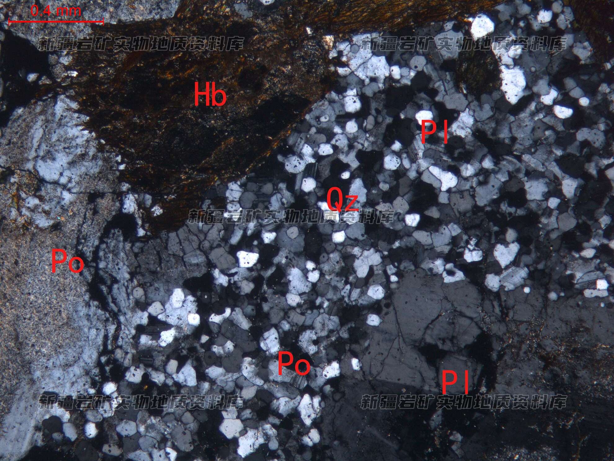 岩石特征描述: 岩石具斑状结构,斑晶为钾长石(Po)、斜长石 (Pl)及角闪石(Hb),钾长石他形粒状,表面具明显泥化现象。基质由细粒斜长石(Pl)和石英(Qz)集合体构成。
