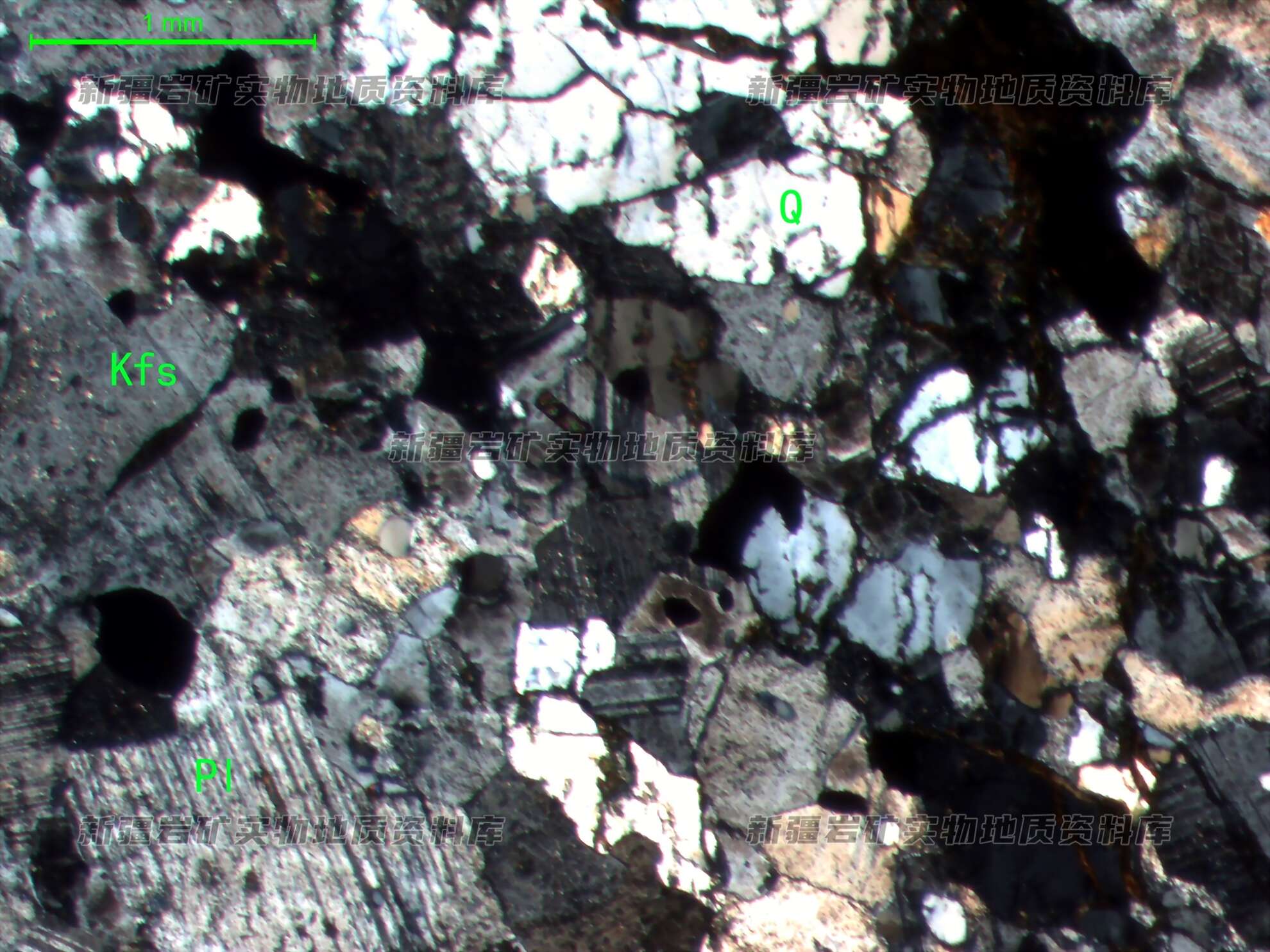 岩石特征描述: 岩石主要由钾长石(Kfs)、石英(Q)及斜长石(Pl)组成,钾长石表面多有泥化现象,石英多见碎裂纹,斜长石双晶可见。岩石主要由钾长石、斜长石、石英和少量角闪石、黑云母组成。受构造应力作用影响挤压,沿裂隙充填绿帘石细脉。