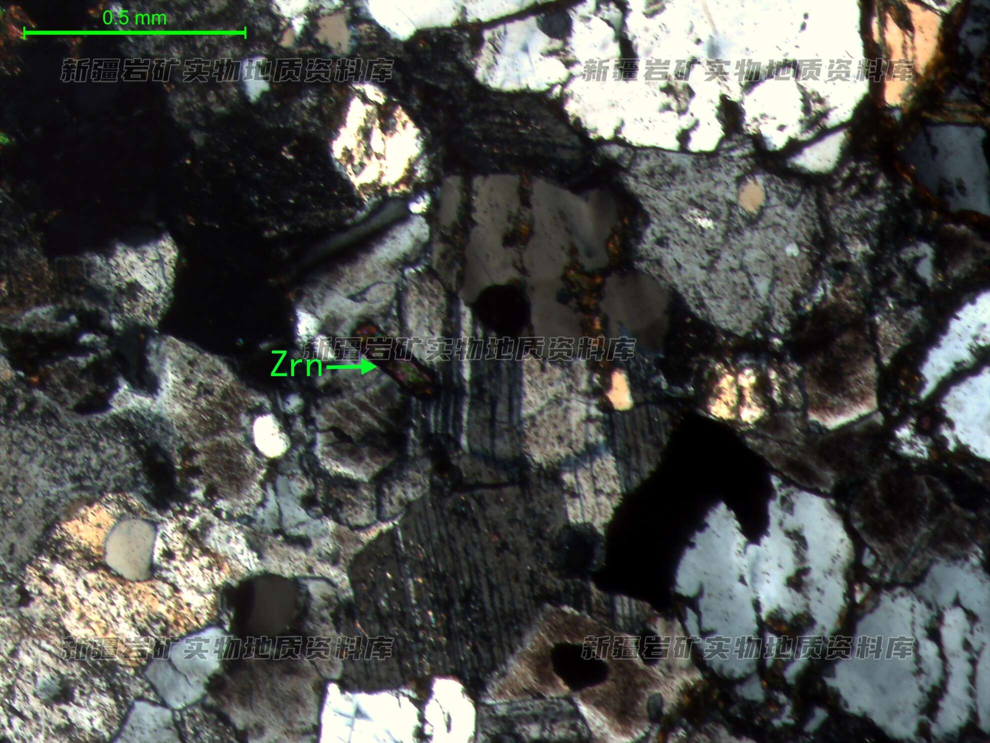 岩石特征描述: 岩石中见柱状锆石(Zrn)分布钾长石、斜长石粒间。