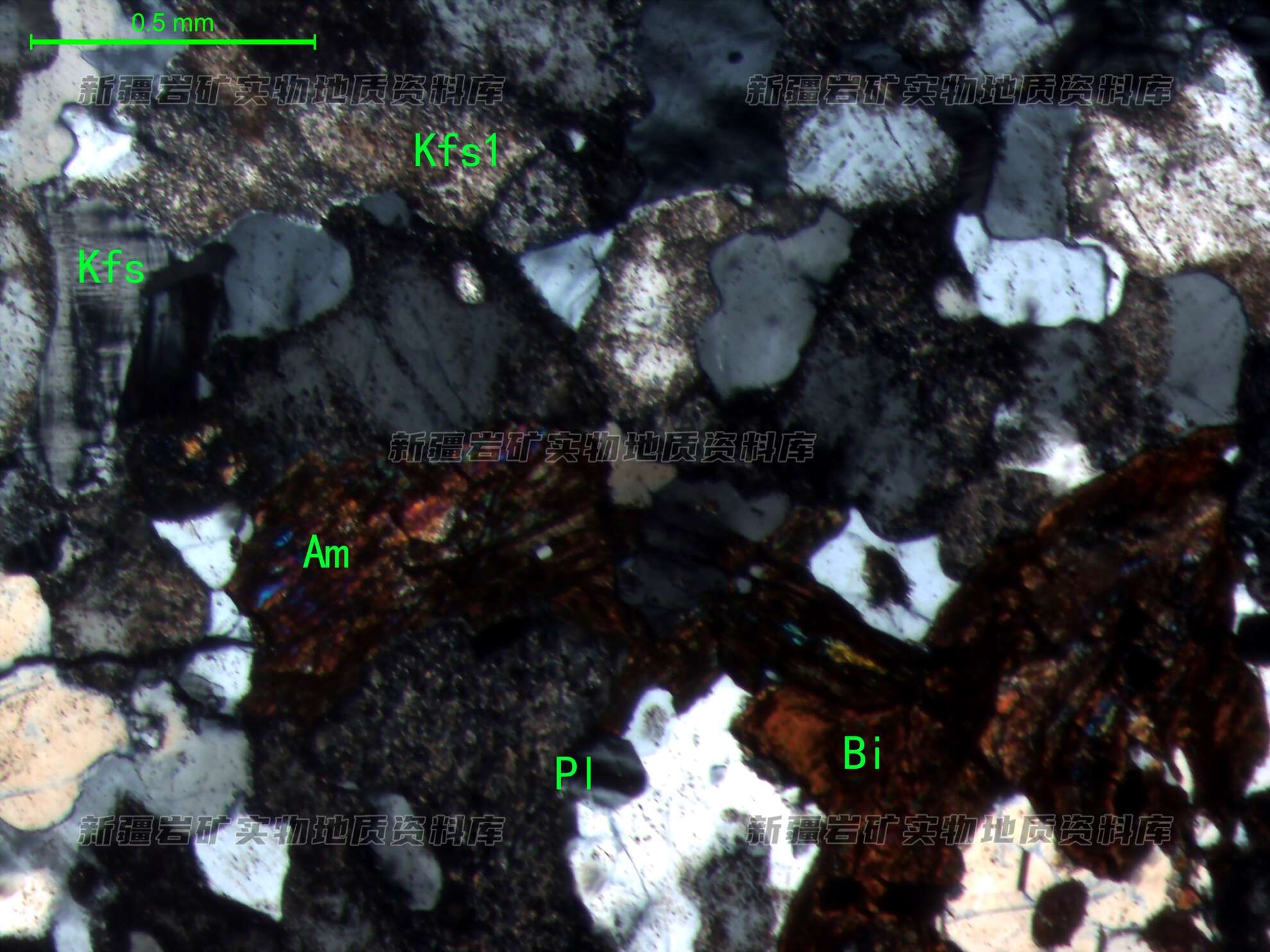 岩石特征描述: 岩石中钾长石有微斜长石(Kfs)、条纹长石(Kfs1),斜长石(Pl)为更长石,柱状角闪石(Am)和片状黑云母(Bi)分布长英矿物粒间。岩石主要由钾长石、石英和少量斜长石、角闪石、黑云母组成,岩石蚀变明显,主要为泥化。