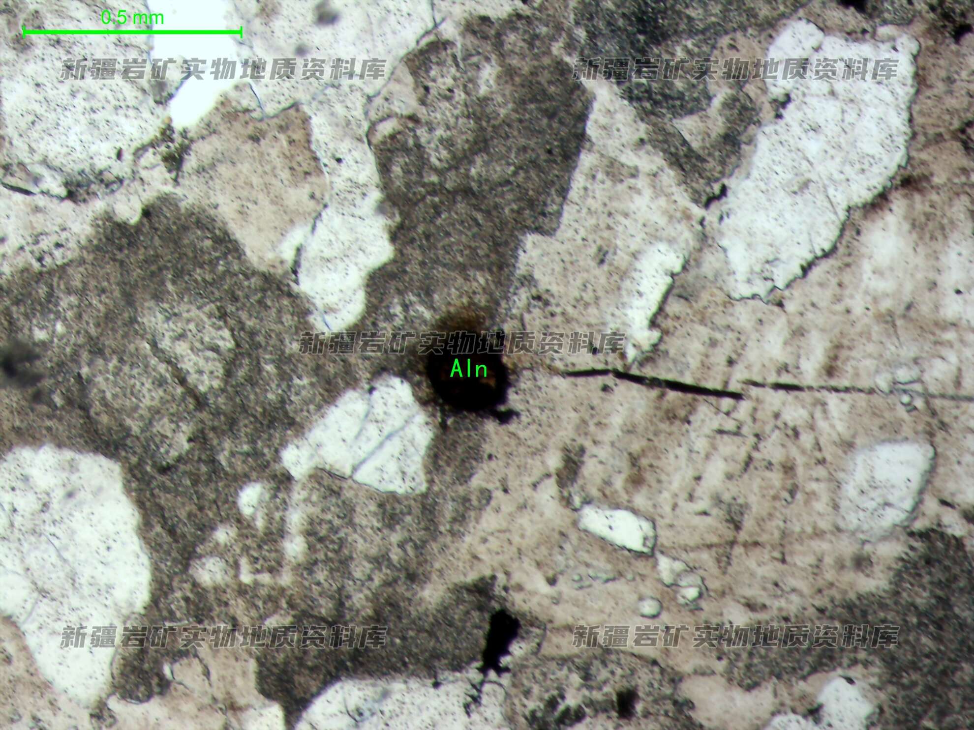岩石钾长石粒间见一粒自形粒状褐帘石(Aln)。