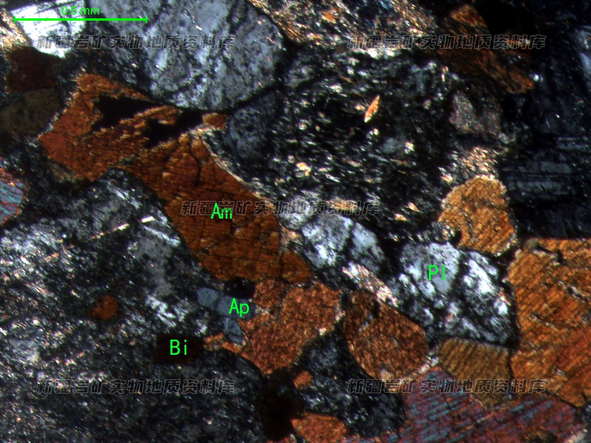 岩石特征描述: 岩石中角闪石(Am)、黑云母(Bi)呈条带状分布,斜长石双晶可见,表面多被绢云母、黝帘石替代。见磷灰石(Ap)柱状、粒状分布角闪石、斜长石粒间。岩石主要由角闪石、斜长石及少量、石英组成,岩石具明显定向构造。岩石见一条方解石细脉斜切片理。